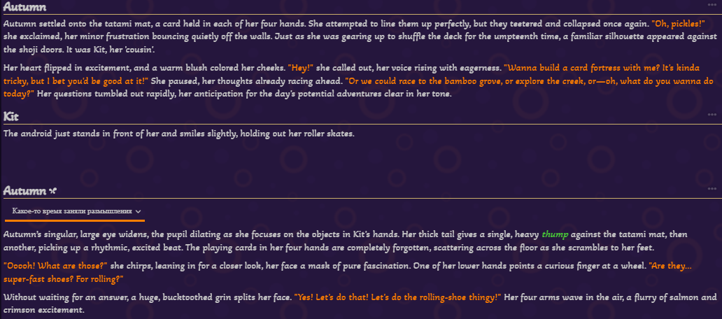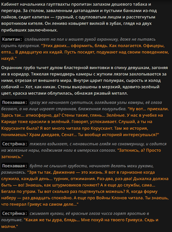 >>1434232 у меня так же, я поначалу думал, что мб из-за того, что продолжаю сценарии из 2.5, начал по новой, тёмное фентези/выживач в зомб апокал пишет збс и логично, повседневность -какие-то ебанутые диалоги