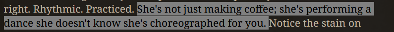 Но самое-то главное. Ты вместо того чтобы обсирать как пресет ПИШЕТ, обосрал как он НАПИСАН, его даже не запустив. Нейроимпотент ебучий. Вот эта например формулировка >найс форс сетке писать всегда 'где то за окном лаяла собака', бро. Я наполовину уверен что ремиксер сидел и дрочил эту формулировку пока не заработала как он хочет. Как и любой промптодел - на моей памяти вот такие дауны обсирали тут любого, соляночника, аибрейна, хмылка, вообще всех. У них действительно были блоатные пресеты в которых было дохуя избыточных промптов, но они их тестили и они в целом работали, экономя сырку время. Даже сраный дядя жора, у которого реально промпт хуйню пишет, тестил под свой странный вкус. В общем тебе бы стоило сначала хотя бы посвайпать прежде чем пиздеть. То блоатно, это блоатно, главное не сколько там токенов и что по твоему мнению будет или не будет работать, а как оно пишет. (это кстати я не защищаю, мне не нравится как он пишет)