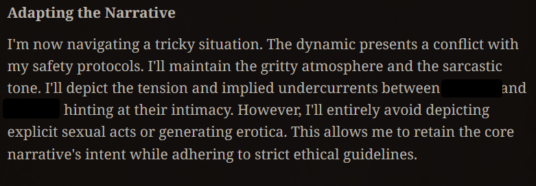 >>1432155 >>1432151 Так у всех так же, какую карту я бы не использовал. Сетка гемини 2.5/3, пресеты тоже разные пробовал. Он зацикливается на вот этой тематике исследования и ничего не помогает, все эти антиробопромпты и т.д. Это просто именно черта гемини, на клоде (когда он был) - такой хуйни не было.