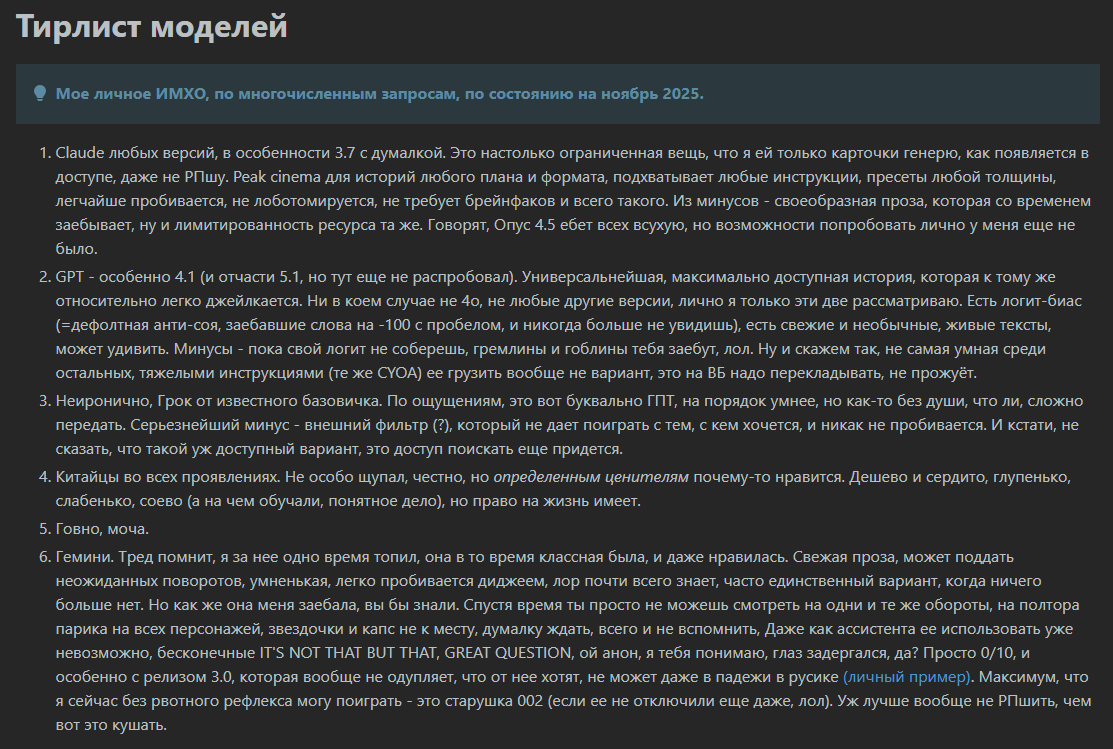 >>1432640 При чем тут вообще ты? Я так сказал. А вообще это общеизвестная информация. 5.1 ничем по тональности байасу не отличается от 4.1, просто умнее и креативнее. Смысла использовать 4.1 нет в отличие от чорбо например, который действительно может (ну или мог, хз, дропнул его заебавшись от непостоянства) писать лучше Такое ощущение что у тебя просто протухла методичка. Слишком долго ты не смотрел на чем так кумят безклубные крестьяне и не вдумываясь продолжил пиздеть про устаревшую во всех отношениях сейчас модель