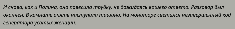 Кроме того, сетка просто не способна просканить всю эту стену истории и понять что не стоит всё время выпячивать учёного, а надо дозировать разумно. Не хватает у неё перформанса по запутанному контексту. Она может его "мысленно окинуть взглядом" (а там везде про учёного в говне мочёного), но не разобрать такие сложные вещи.