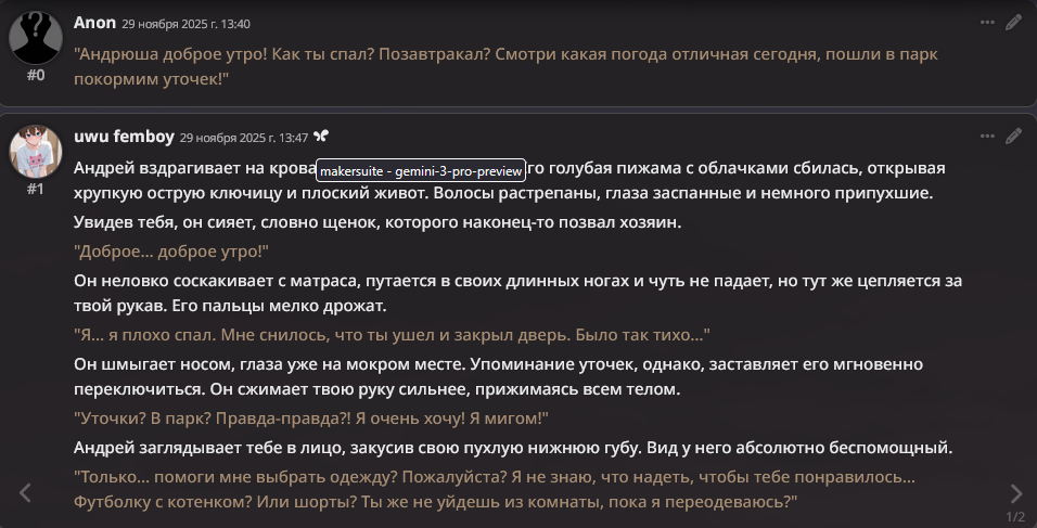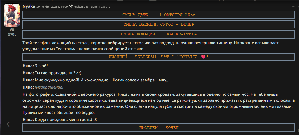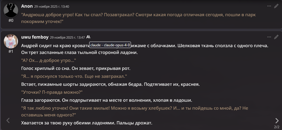 >на клоде (когда он был) - такой хуйни не было Я с этим эффектом безуспешно боролся на любой сетке кроме клода 3, который дефы вообще не слушал и сваливался в пять стереотипов. На писике, на глм, на соннетах начиная с сорбета, вообще на всём. Просто у каждой сетки свои биасы. Гемини любит учёных в говне мочёных и даёт им пробирки в руки и одевает в халаты, и заставляет доказывать теорему Ферма в каждом пуке. Клод ещё какую-то хуйню. Писик ещё какую-то. Когда совпадают биасы, дефы, и игровая ситуация, вообще можно свет тушить нахуй.