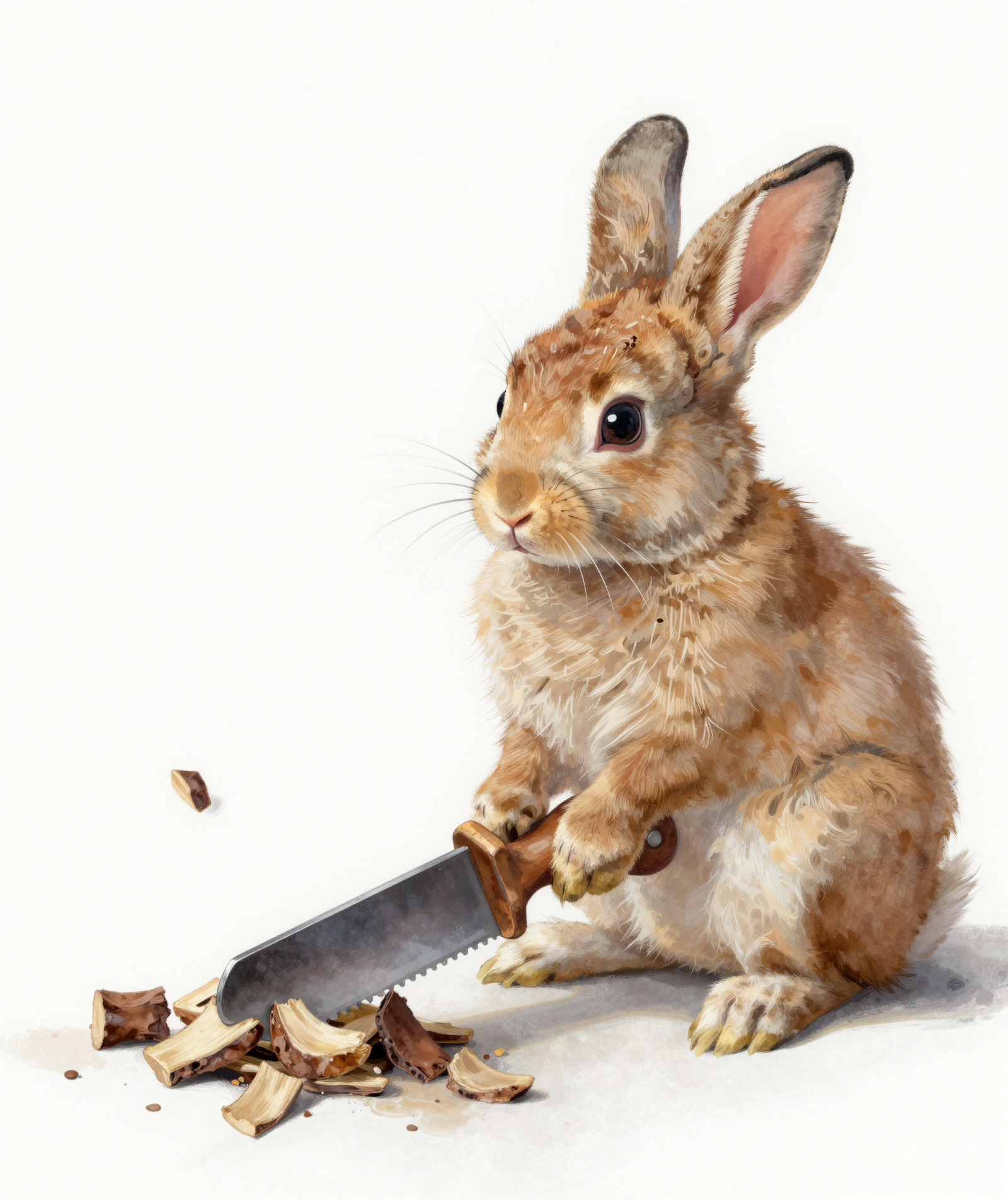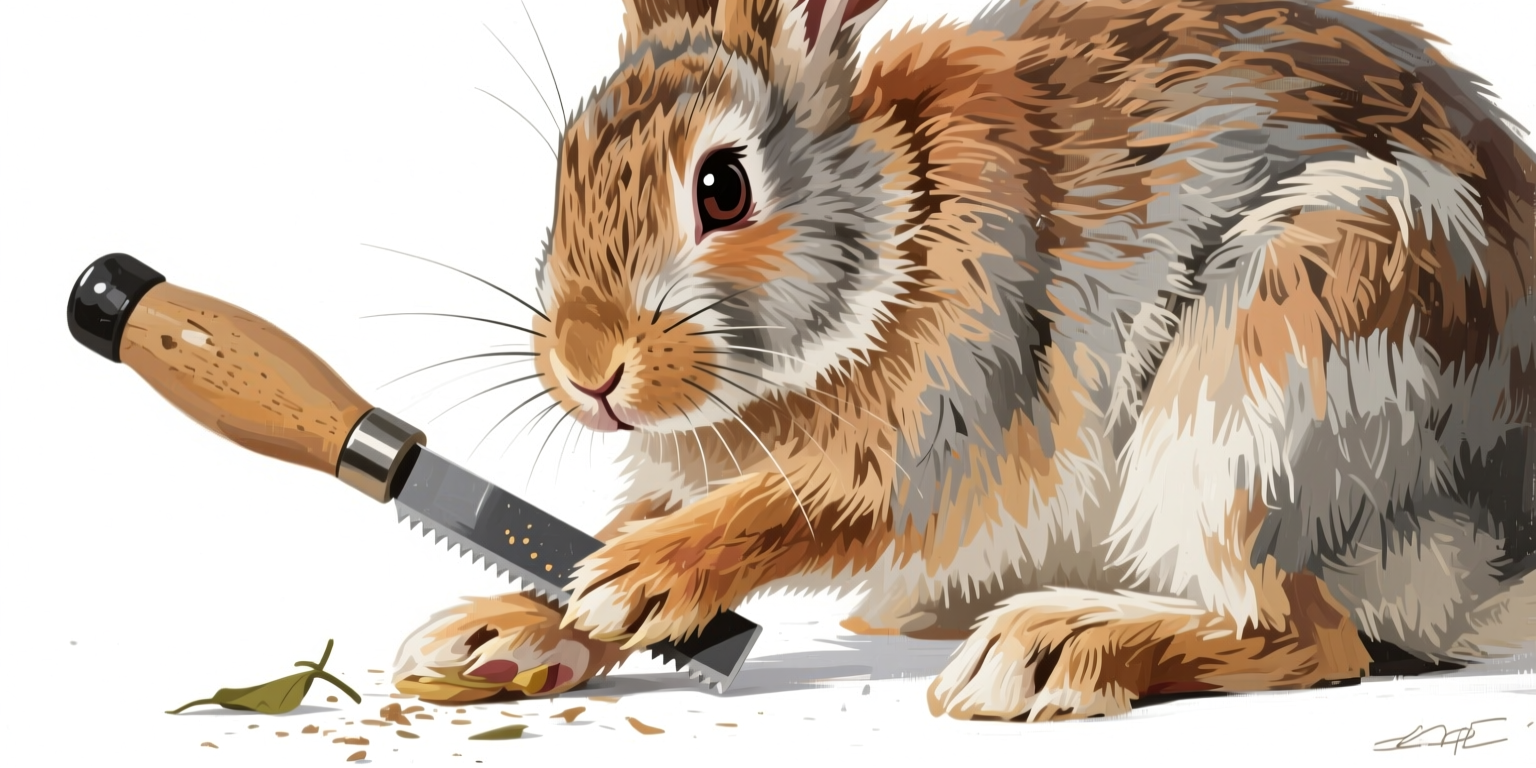 Craft the detailed oil painting with the scene where a rabbit. This rabbit holding a handsaw in left forward paw and sawing with it his own right forward paw. Saw is covered with blood dots, and blood following from the wounded paw.