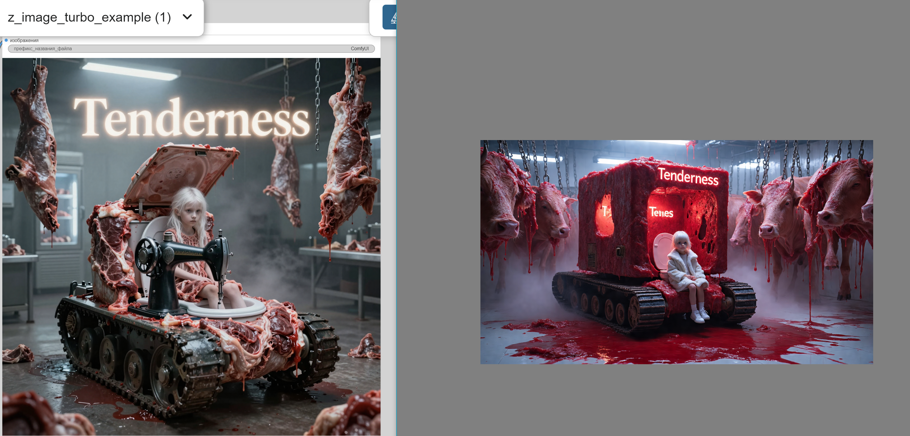 >>1434220 У тебя ещё хоть какие-то цвета есть. После Qwen-Image, с promptами тут просто беда. Пытался другой text encoder подключить, qwen_2.5_vl_7b_fp8_scaled.safetensors, не заработал. Promptы надо писать совсем по-другому. И при этом половина promptа просто выбрасывается. Как ты освещение сделал на последнем пике справа на z-image, это вообще любопытно. Кроме того, на этом z-image полезли опять деформированные конечности, лишние пальцы, многоножие и подобные косяки.
