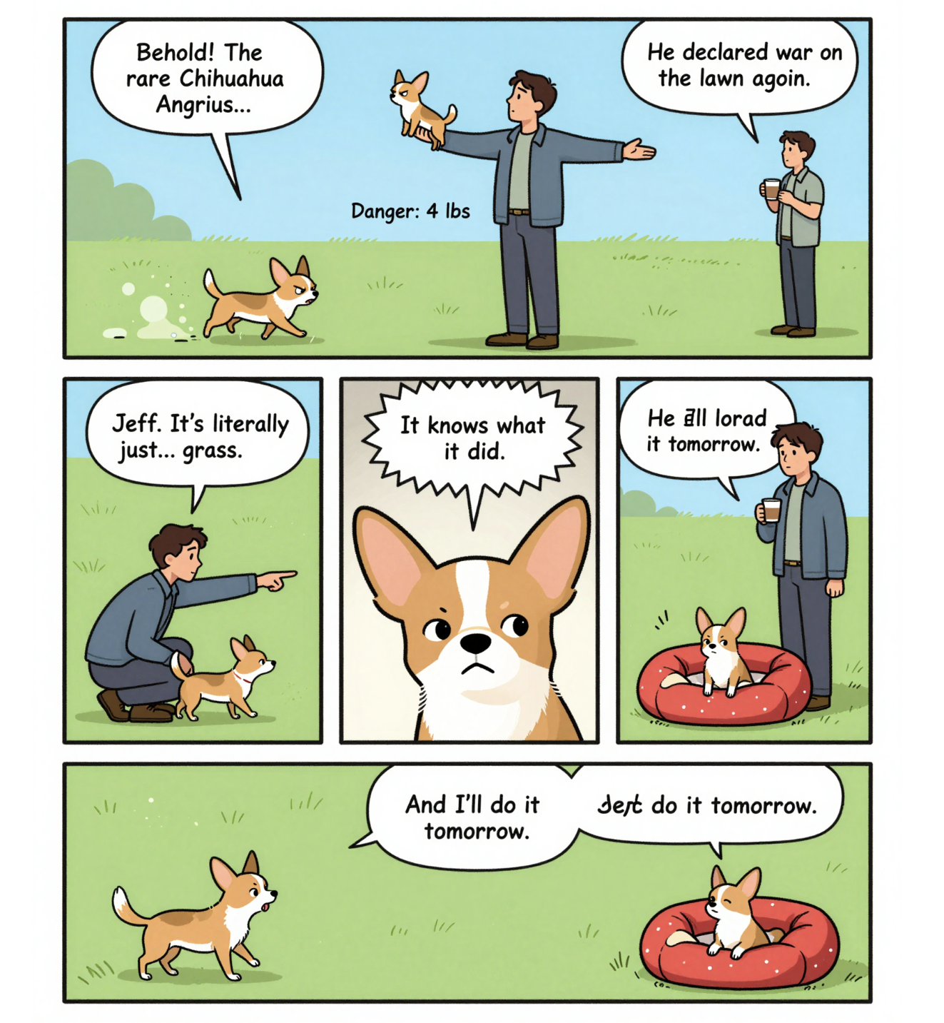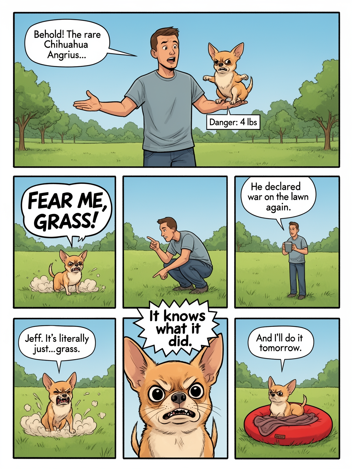 Panel 1 (TOP – wide) Scene: A man stands in a sunny park, arms out like a documentary host. A tiny furious Chihuahua is held up in his hand like a wildlife specimen. Text (man speech bubble, top-left quadrant, pointed at man): “Behold! The rare Chihuahua Angrius…” Text (small label below dog like a name tag, centered under dog): “Danger: 4 lbs”