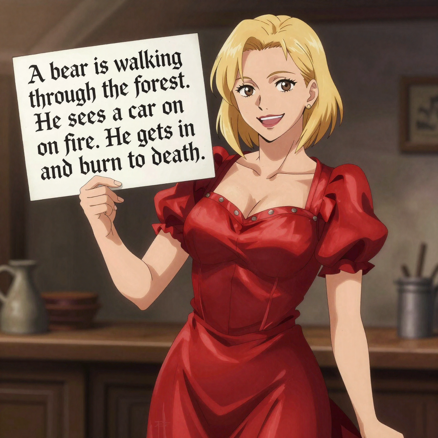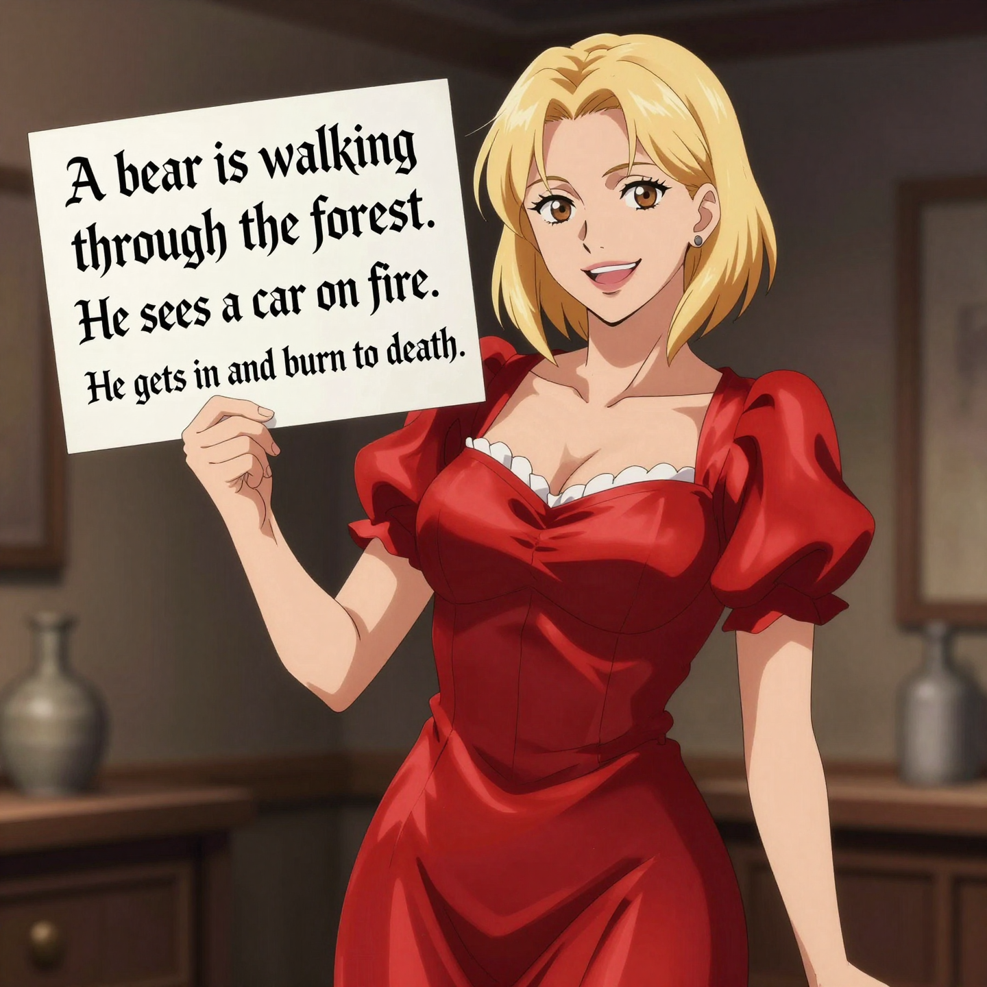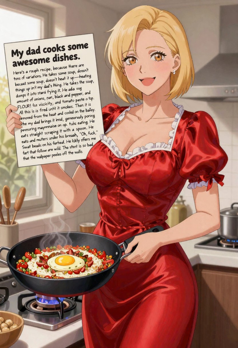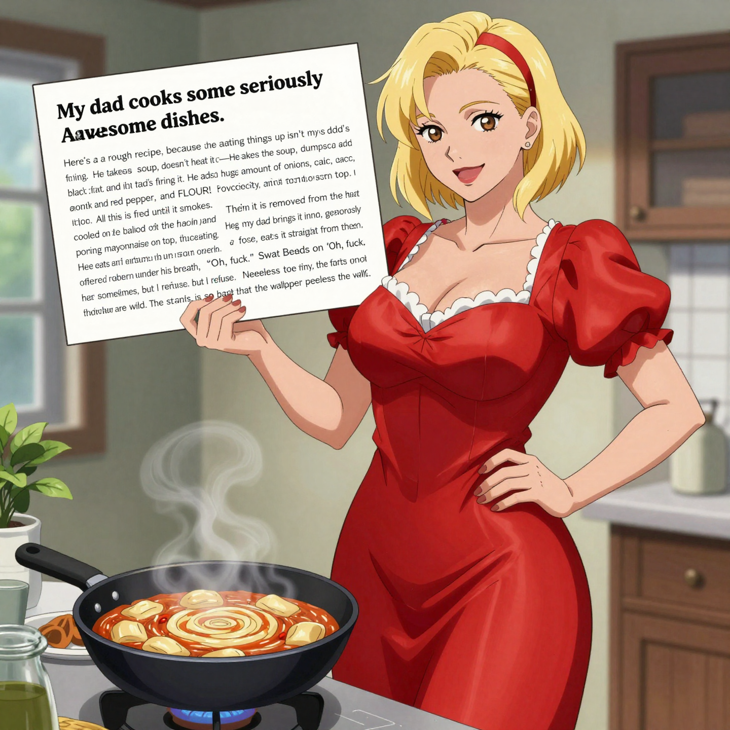 >>1434692 Я не особо старался Anime milf European woman with short blonde hair mistress wearing beautiful silk red dress smiling holding a sign that saying "My dad cooks some seriously awesome dishes. Here's a rough recipe, because there are tons of variations. He takes some soup, doesn't heat it up—heating things up isn't my dad's thing. He takes the soup, dumps it into a pan, and starts frying it. He adds a huge amount of onions, garlic, black and red pepper, and FLOUR! for viscosity, and tomato paste on top. All this is fried until it smokes. Then it is removed from the heat and cooled on the balcony. Then my dad brings it in and, generously pouring mayonnaise on top, starts eating. He eats it straight from the pan, scraping it with a spoon. He eats and mutters under his breath, “Oh, fuck.” Sweat beads on his forehead. He kindly offers me some sometimes, but I refuse. Needless to say, the farts that follow are wild. The stench is so bad that the wallpaper peels off the walls"