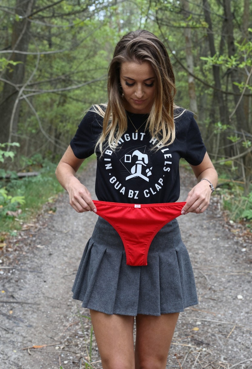 On a path in the woods a 25 years old girl dressed in a black T-shirt and black skirt with a red panties under it shows her panties by raising the skirt.