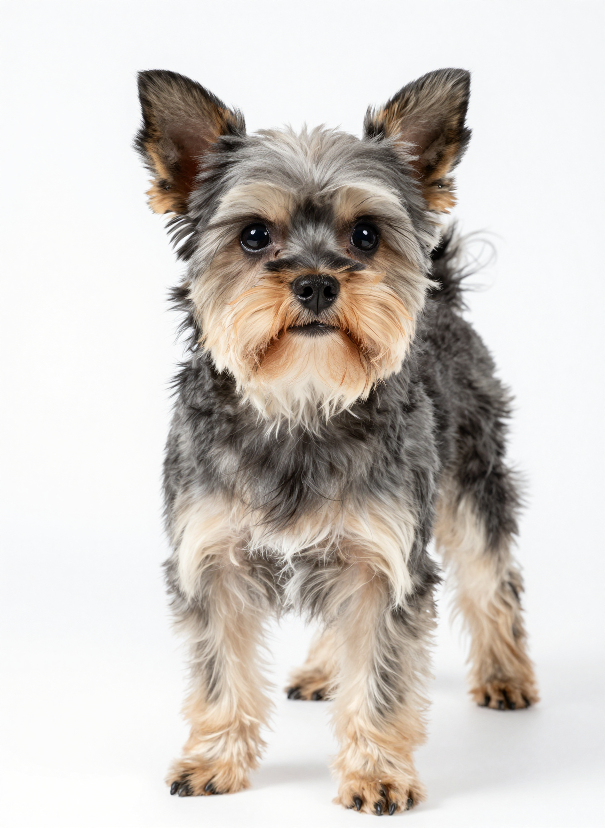 Panel 4 (BOTTOM 3 – square, middle right) Scene: Dramatic zoom-in on Jeff the Chihuahua, face filling 40% of the panel, eyes shaking with determination, little tail visible behind him like a stiff antenna. Text (dog bubble, top-center of panel, jagged border, pointed at dog): “It knows what it did.”