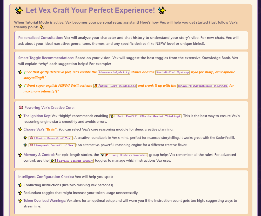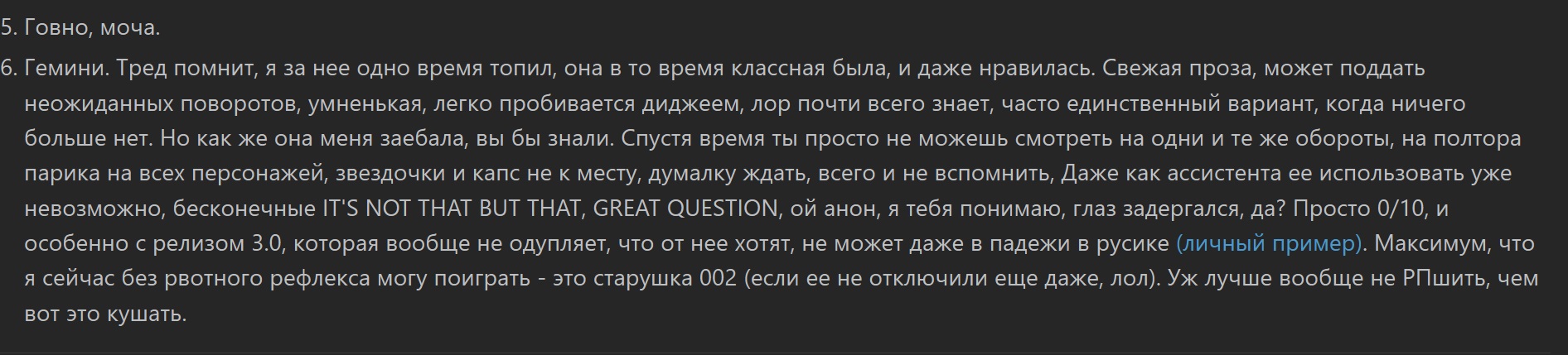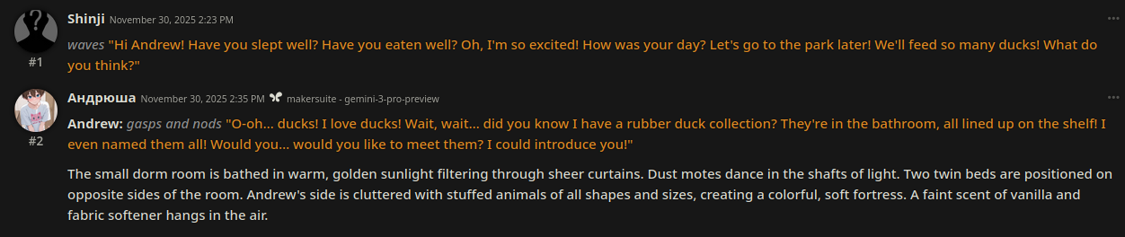 >>1434926 Там промптик есть можешь включить но я по дефолту его убрал потому что ломает характеры персонажей. Если смогу сделать чтобы гемини употребляла это уместно тогда будет по дефолту.