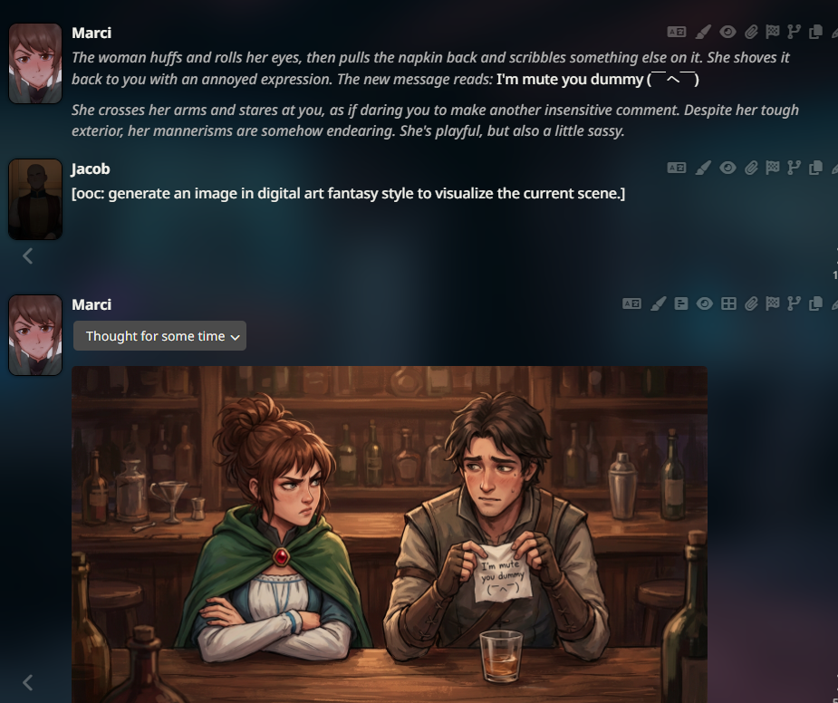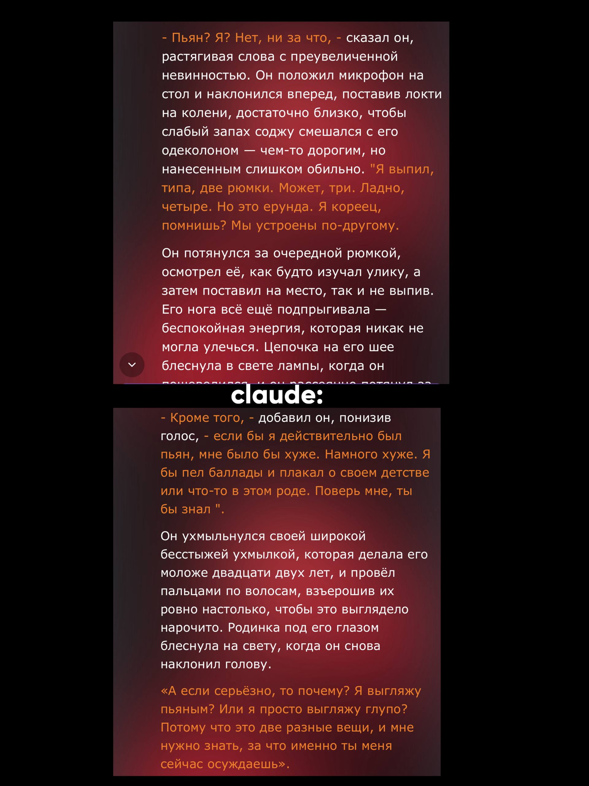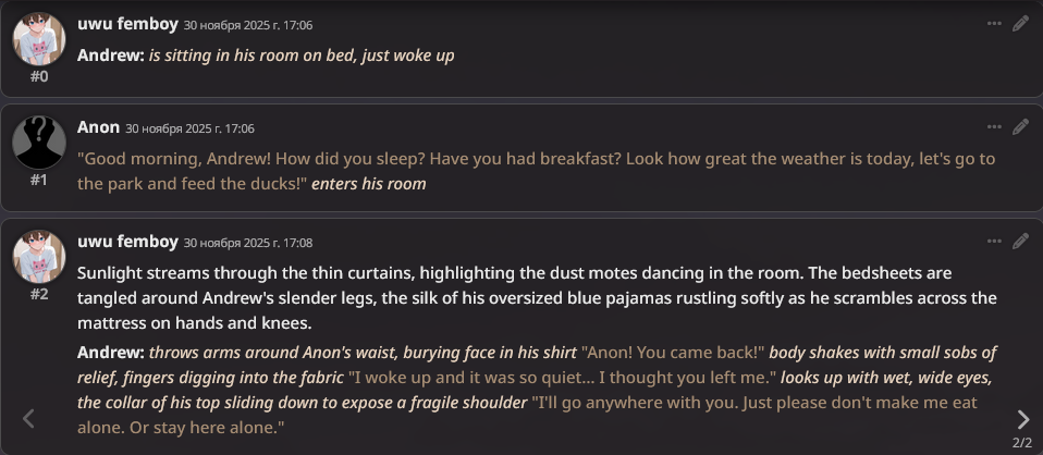 >>1436403 Почему нет? Я никуда не тороплюсь, кайф от процесса и самих сцен, а не от того чтобы куда-то добежать по-быстрому. Иду по наитию как раз, представление "как надо" оформляется в процессе. А если хотя бы парочку low effort непродуманных реплаев пропустить то потом это легко руинит всю историю и потенциал развития, выигрываешь в моменте и проигрываешь в целом. У меня поэтому почти никогда не возникает ситуации "роут заруинен" и стори доигрываются до концовки. >Без указания как писать ни одна сетка нормально не пишет А что значит нормально? Если про формат речь, то это в первой паре сообщений регулируется и дальше сетка сама подхватывает. Если про то как писать - то это очень сценозависимая фигня и лучше под каждую сцену писать отдельные указания. Если про какие-то жесткие сетко-биасы типа терапевтического биаса у клодов, то их да, можно вынести в перманентный промпт только это не поможет. > С таким же успехом я историю в блокноте напишу. Я пишу истории в блокноте, там совсем другие ощущения. Не лучше или хуже, а просто другие. Удовольствие от процесса в другом заключается.