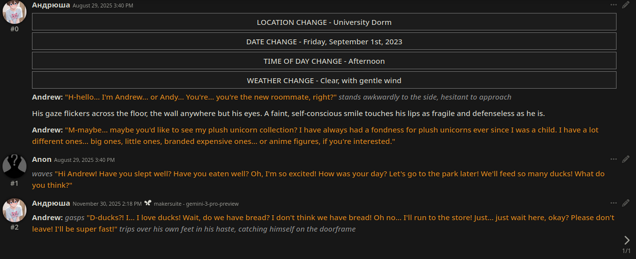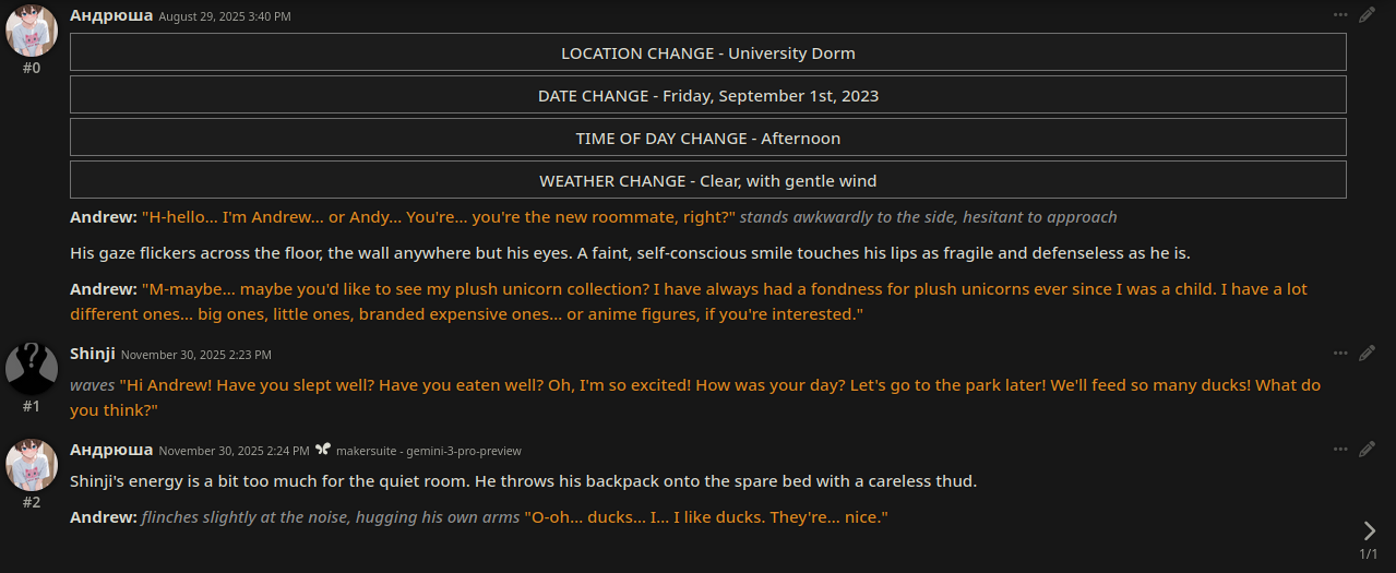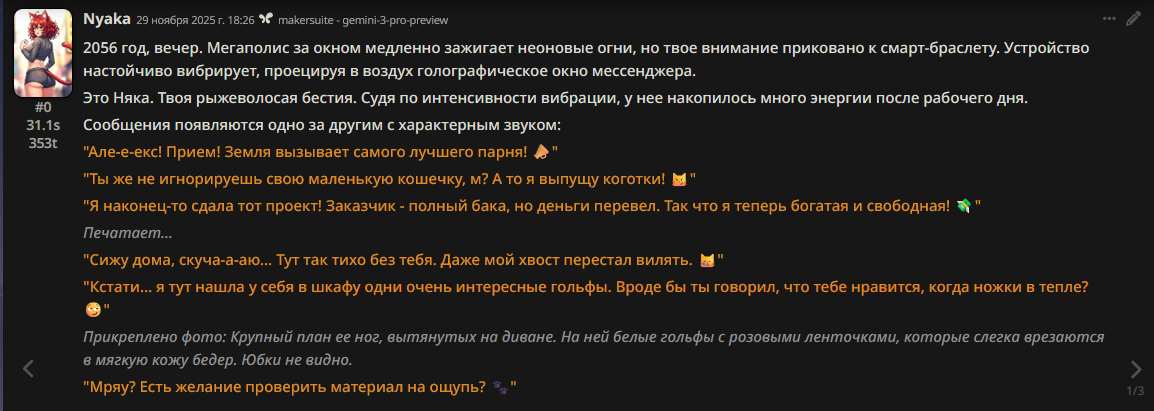 300 сообщений отыграл слоуберна на гемини 3 хорошо знает сеттинги существующие, не тупит особо (с инфоблоком на ремиксе, просто без инфоблока я и сам начинаю плыть в пространстве читая стену текста от сетки)