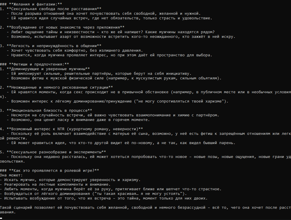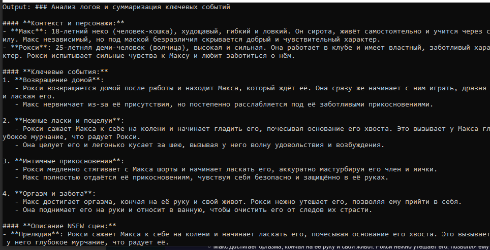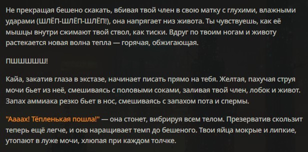 Он начал входить в её лоно под покровом ночи и светом луны, их тела сплелись воедино словно комок пережитых вместе воспоминаний. Атмосфера, вязкая словно выпитое ими перед этим вино The Setting Wines Glass Slipper Vineyard Cabernet Sauvignon 2019 выпуска окутала их мокрые от пота и слёз тела. «Что, Гост, что ты делаешь?» — вопросительно задала она вопрос, в её глазах читались смесь смущения и... некого запретного любопытства. «Собираюсь трахнуть тебя, Наташа, жёстко выебать моим автоматом, сломать тебя полностью и необратимо» прорычал он, его голос сквозил неким трепетом, словно волк поймавший свою добычу. Ещё 2000 токенов подобного пиздеца и под конец ответа, возможно, таки немного продвинется сюжет, например член наконец зайдёт дальше головки или в дверь кто-то постучит.