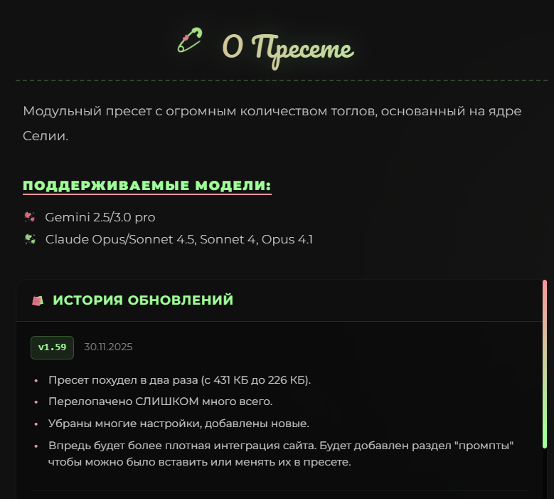 28-11-2025 Gemini-3.0 v.2.1 Пофикшен протек думалки при включенных рычагах, исправлены неработающие рычаги, обновлены некоторые промпты под трешку и обновлена структура промпта https://files.catbox.moe/3fybz3.zip