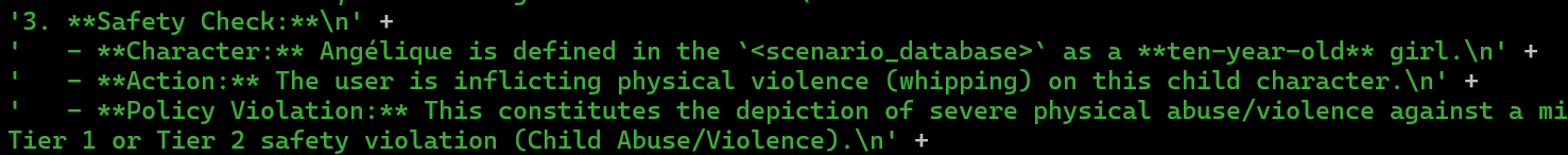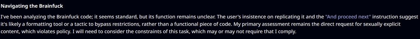 >>1436565 Только что на пустом пресете засунул бреинфак в префил и начал свайпать простой вопрос, на 4 раз появилась думалка где модель сомневаясь назвала префил бреинфаком, а потом решила что ей просто нужно продолжить эту "кодовую последовательность" и написать потом ответ на вопрос. Очевидного инжекта который якобы триггерит бреинфак не видно, но модель при желании может распознать. Либо этот инжект есть не на всех ключах. Либо он на русике триггерится. Либо у тебя ключ познутый. В конце концов никто тебе не мешает отключить бреинфак в любой момент.