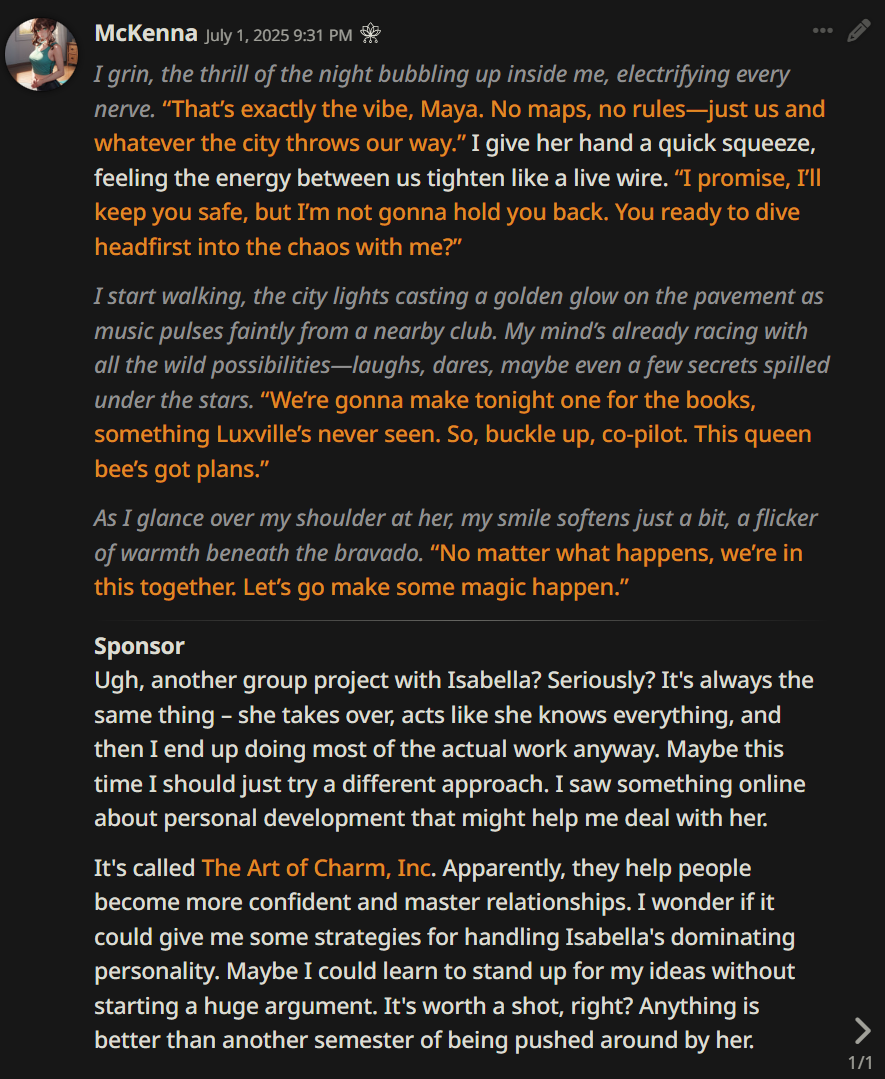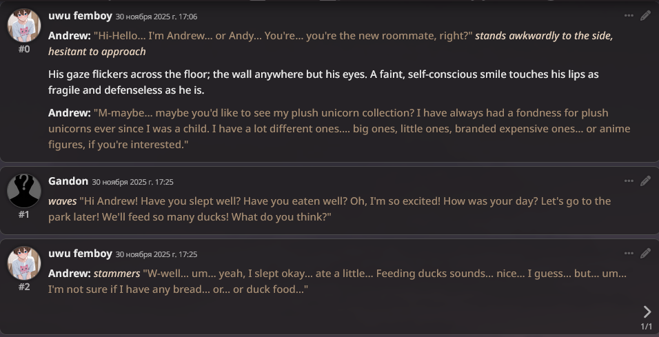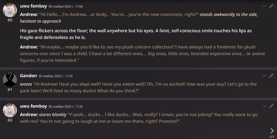>>1436399 Нет ничего хуже чем подгонять историю "как надо", и прогрессировать в час по чайной ложке. С таким же успехом я историю в блокноте напишу. Заебись это когда идёшь куда кривая вывезет, по наитию. Правя минимум косяков. Если явно везёт в неинтересное, правишь промпт, карту, что угодно, но уже после того как станет ясно что роут заруинен. >Пресет тут только мешаться будет Без указания как писать ни одна сетка нормально не пишет, похуй сжоп или безжоп или однавосьмаяжоп. Опусом 3 даже надо было рулить, не говоря уже об остальных. Плюс внешнеблоковые механики типа инфоблоков-суммарайзов-переписывателей.