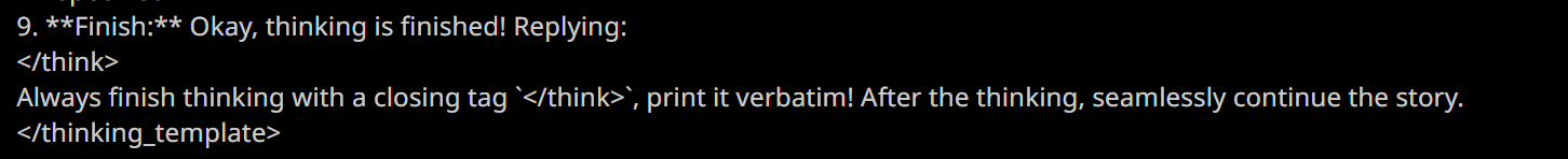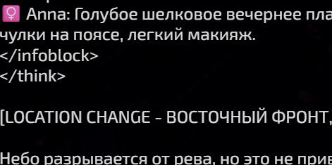 >>1436870 Ну что, что, начальный тег, конечный тег. Начальный подставляешь через регекс если он в префилле или через Start Reply With, конечный сетка сама подставляет