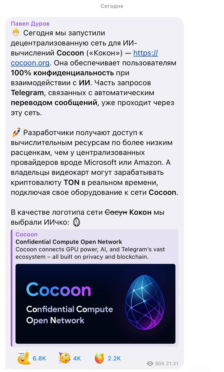 Бегло глянул, как я понял они поддерживают проброс GPU https://cocoon.org/docs/gpu#gpu-passthrough-vfio , т.е. даже не токены можно покупать, а GPU-часы, как на vast.ai каком-нибудь. Надо разобраться, звучит непонятно как это работает в отрыве от хоста и линков, на васте это серьёзное ограничение.