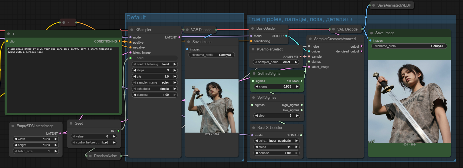Аноний, хочу показать тебе воркфлоу для Зит чуть сложнее дефолта, но в большинстве случаев получаются лучше пальцы, позы, свет, в целом анатомия лучше. Иногда конечно ахинея получается. По скорости тот же дефолт(он там для сравнения картинки). Я там может напутал с подключением сигмы, но оно именно так должно и быть для такого результата(вообще случайно получилось). Можно слегка подстраивать ноду SetFirstSigma(зеленым выделил) картинка сильно меняется. Короче, интересует твое экспертное мнение. Воркфлоу в первой картинке. Вторая дефолт - сравни пальцы. Что скажешь?