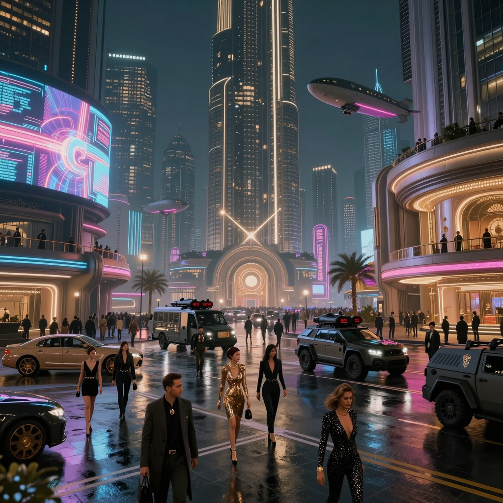 >>1443322 Да, беру промпты у ллмки > A highly detailed cyberpunk future cityscape at night with a crowd of people living in luxury under a strict authoritarian regime. Neon lights reflecting off wet streets, advanced technology with holographic advertisements, people wearing high-tech fashion and expensive accessories. Authoritarian symbols on buildings, military presence with armored vehicles patrolling. Luxury cars and airships hovering above, opulent skyscrapers with exclusive clubs and casinos. Sharp contrast between wealth and control, cinematic lighting, 8k, photorealistic style Сначала дура проигнорировала часть промпта, затем подменила азиатов на людей, после чего действительно нарисовала по теме. А рисованные изображения нейронка не любит > happy old man