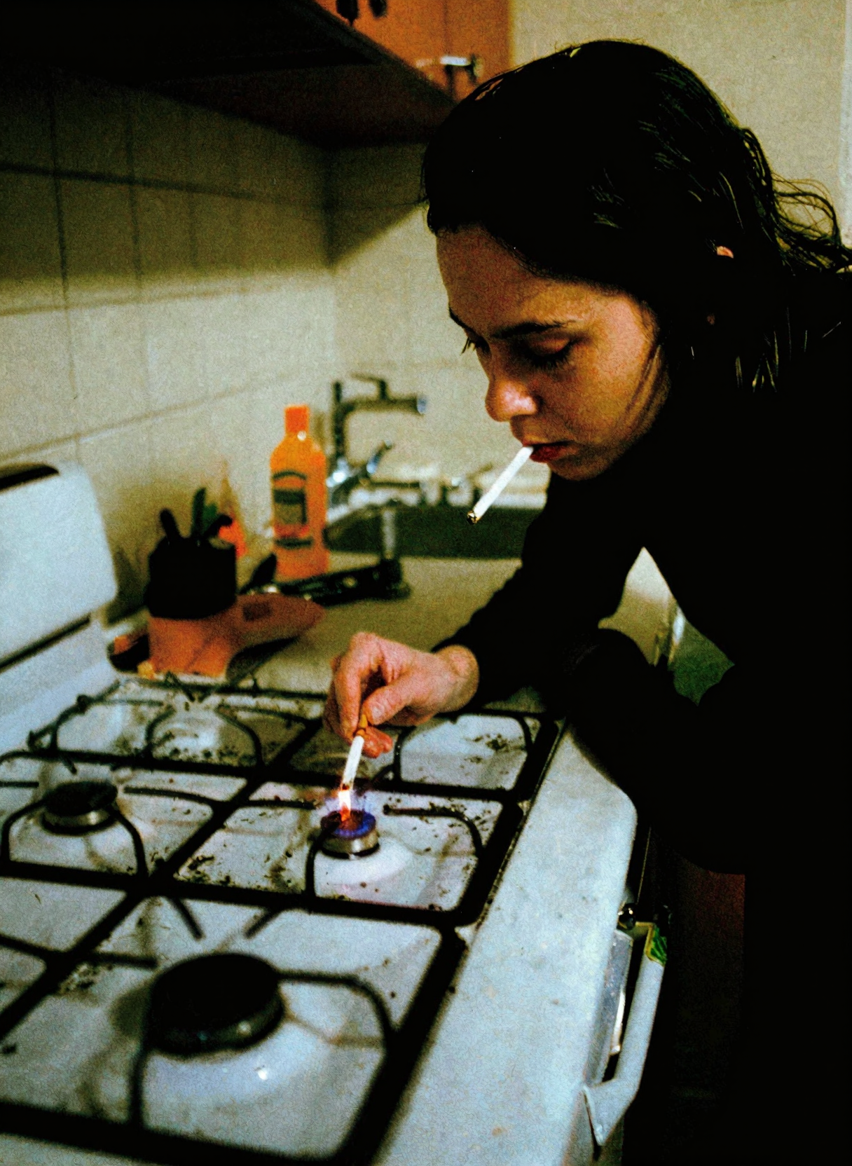 Создай картинку/фотографию в стиле ... с двумя персонажами: Анна - девушка 19 лет в зеленом свитере, блондинка ... Ольга - женщина 40 лет, в форме полицейской, ... На изображении персонажи в комнате (описание комнаты), Ольга сидит за столом, Анна стоит у окна. Ольга что-то пишет в тетради. У Анны в руке кружка с кофе. ...