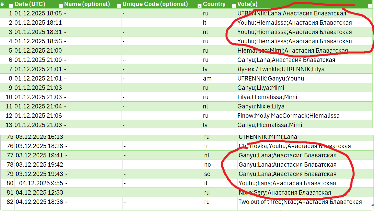 Ну и что, что друзяшки по конфе одинаково проголосовали еще до того как опрос запостили (запостили в 24 по москве, то есть в 21 по UTC как в табличке). А потом еще решили под конец голосования догнать до первого места, а то чет мерчант обгонял по голосам, а скручивать еще не решили.