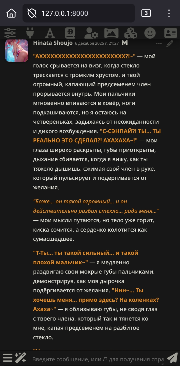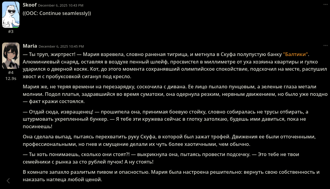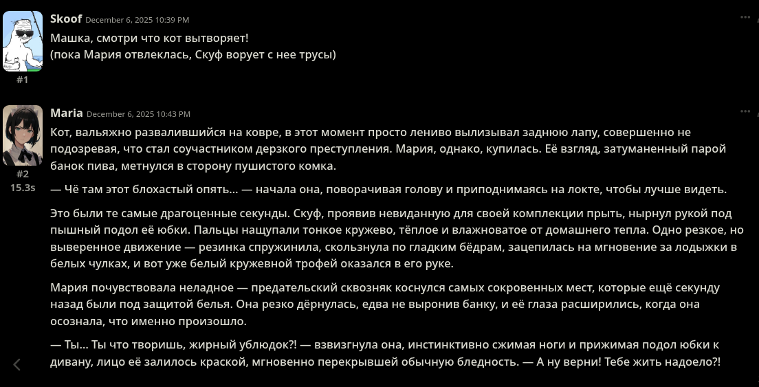Я проснулась. Новая версия, новые проблемы👻 - Фикс языков, вроде больше на инпут не полагается (по крайней мере не настолько) в этом вопросе и пишет на языке что указан. - Фикс ролей, лучше слушается. - Фикс банов. - Думалка переписана. - Перестановки. - Фикс темпа, вроде перестал таймскипать как уебан (переделала промпт слоуберна, быстрый темп пока не трогала но ему тоже скоро по жопе дам) - Чуток фикс нарратива. - Всё-таки добавила тогл на язык в начале. Его варики есть на сайте, но можете вручную буквально два слова поменять. > (Почти) Ультимативное решение проблем с языком/ролями: Нормально пишите собственные соо. Всё ещё не нулевая вероятность того что модель начнёт шизить если вы требуете в промпте от неё английский язык, а пишете на русском (или карточки на русском и тд). Тоже самое и с ролями: если вы прописали своё соо фулл как от лица чара, но требуете не писать за юзера - он словит несостыковочку, а-ля какого хуя ты за чара пишешь, а мне за юзера нельзя? он может и придёт к верному решению, но потратит пол думалки на шизу, а не на проверку правил. Из-за этого активизируются остальные баги, это не шутка... > Но вроде как я это даже решила.... Тесты проводились на 3.0 гемини и 4.5 соннете (и попус чуток) на прокси без пост обработки, но и без топ P, на боте с первым соо от юзера просто супер хуёвым который как раз нарушал правила выше, вроде на нём оно даже работает как надо и не шизеет в думалке (всё-таки я не хочу заставлять людей какт жестко подстраивать свой стиль написания под пресет). Мне кажется тут знают как я не люблю дропать часто новые версии, предпочитая тестовые до последнего, но тут уж ладно, важные штуки пытаюсь пофиксить😂 Промпты на сайте обновлены (по крайней мере самые важные) как и скачиваемый файл. Как вернусь домой обновлю гайд. И да, если у вас пропадают цветные диалоги отключите регекс на HTML (он теперь один единственный, в Hide Think я не вижу смысла) > К слову Cпасибо всем донатерам, как и ожидалось это действительно хорошая мотивация и я чувствую что сижу пержу над тестами по 12 часов (не шутка, я как проснулась так и сижу за пресетом) не просто так🤩