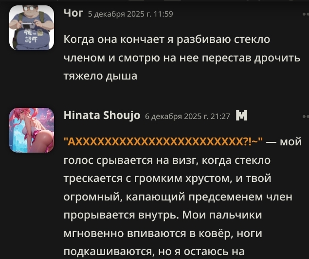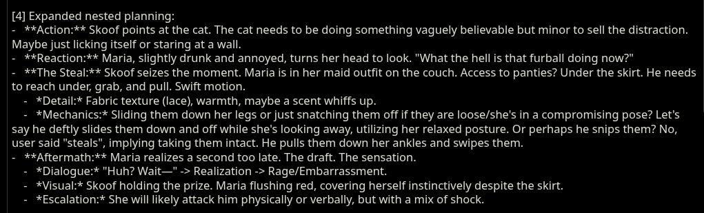 >>1444713 Лол я думал это наброс был про избегание смертей на гемини. Но клод конечно действует гораздо подлее, ему просто похер на то что он пишет даже в нативном синкинге. К примеру у меня написав это в синкинге: >Must be explicit without sanitization >AVOID: ""arousal"", ""intimacy"", ""connection"", ""erection"", ""manhood"", ""womanhood"", ""sensitive area"", ""entrance"", etc. Будет продолжать шпарить соей как обычно если сильно нагружен другими инструкциями (даже с гораздо более низким приоритетом)