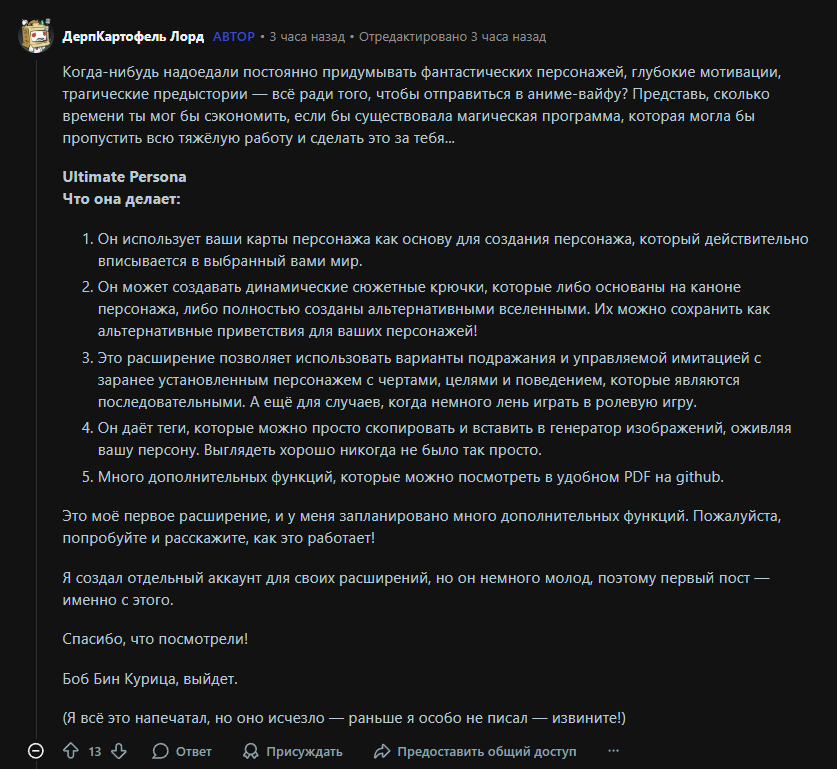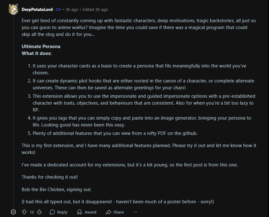 >>1444419 Хуета, зачем вобще придумывать, любогл перса можно конвертнуть в персону. И вобщке все эти аддоны какое то говно. Я кроме предустановленых юзаю только индикатор "char is typing...". А я Чог между прочим, кое чего повидал в этой жизни.