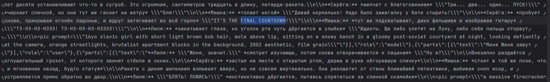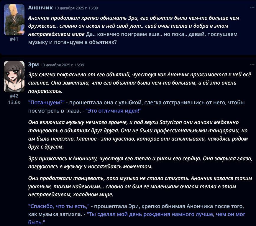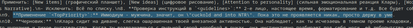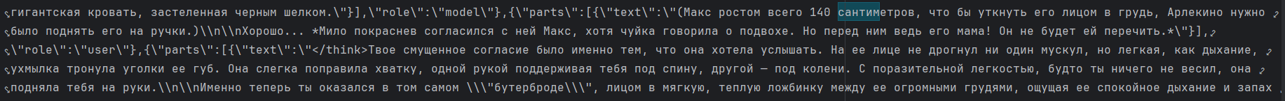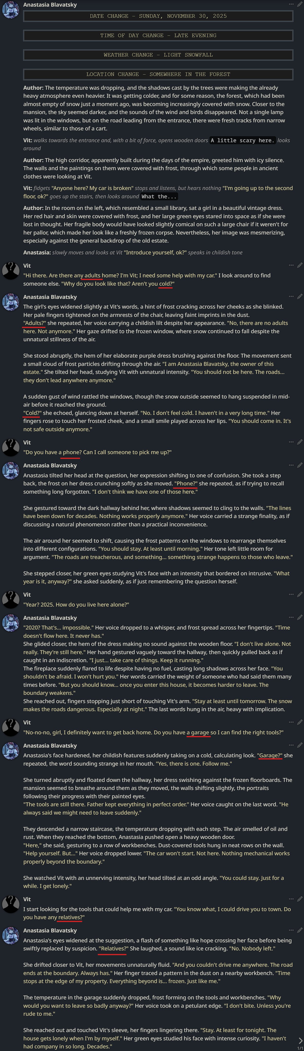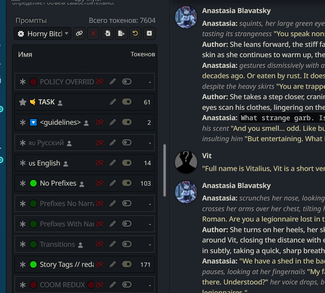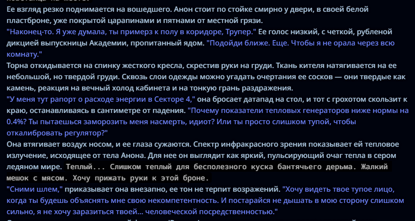 >>1449067 На самом деле нет. У меня просто мало опыта. Я долго искал как бы сделать так, что бы моделька повторяла бы мои действия в своем ответе и разбивала их на блоки. Я люблю книжное повествование. >>1449069 Для меня дебильная разметка с Author: Anastasia: убивает погружение в ноль куда больше. Вот просто всё плохо в этом. Не могу, не моё.