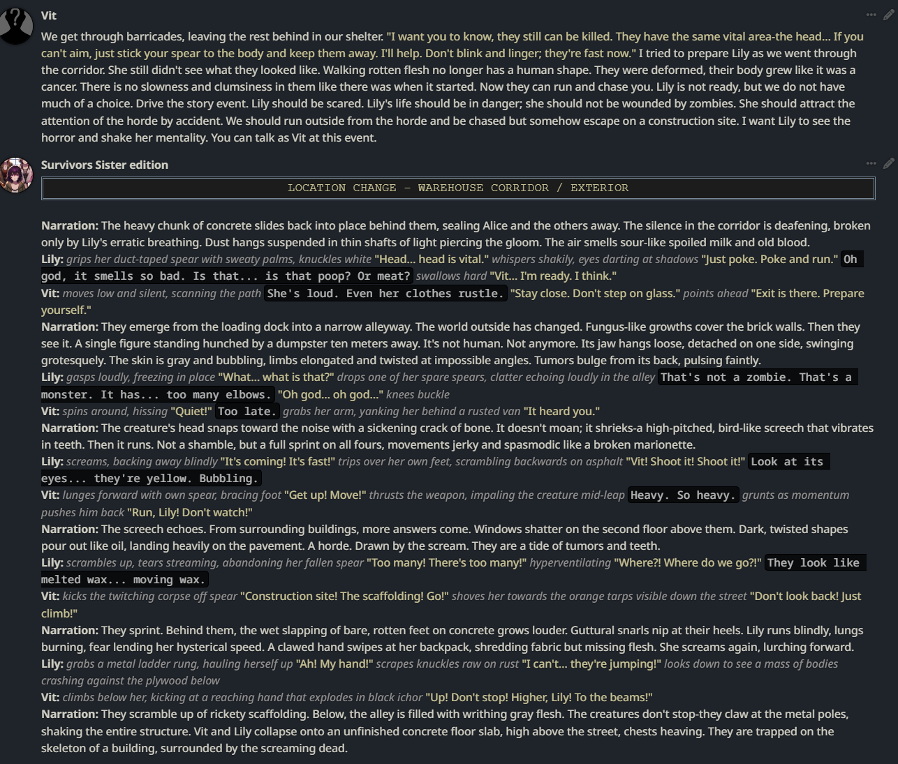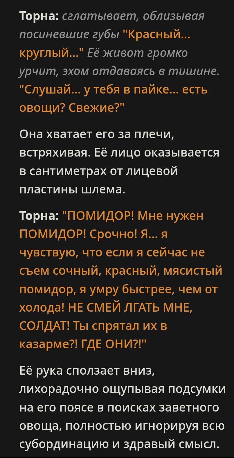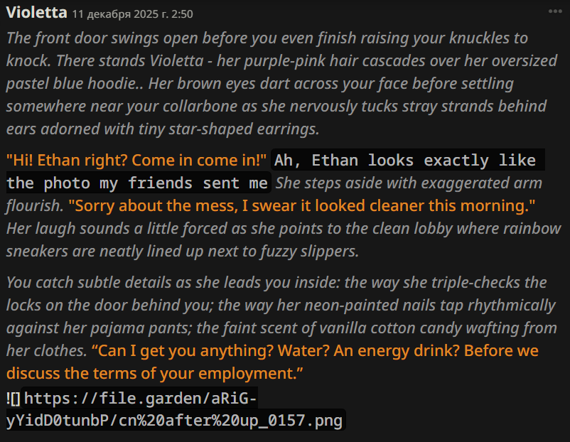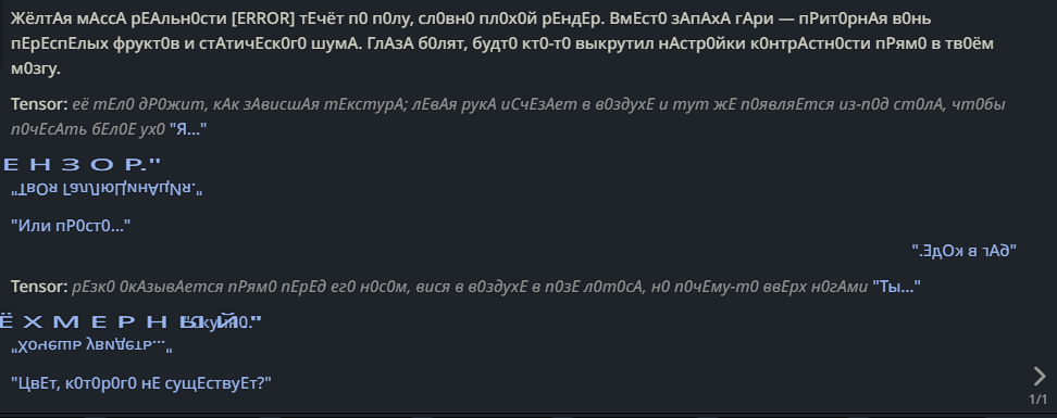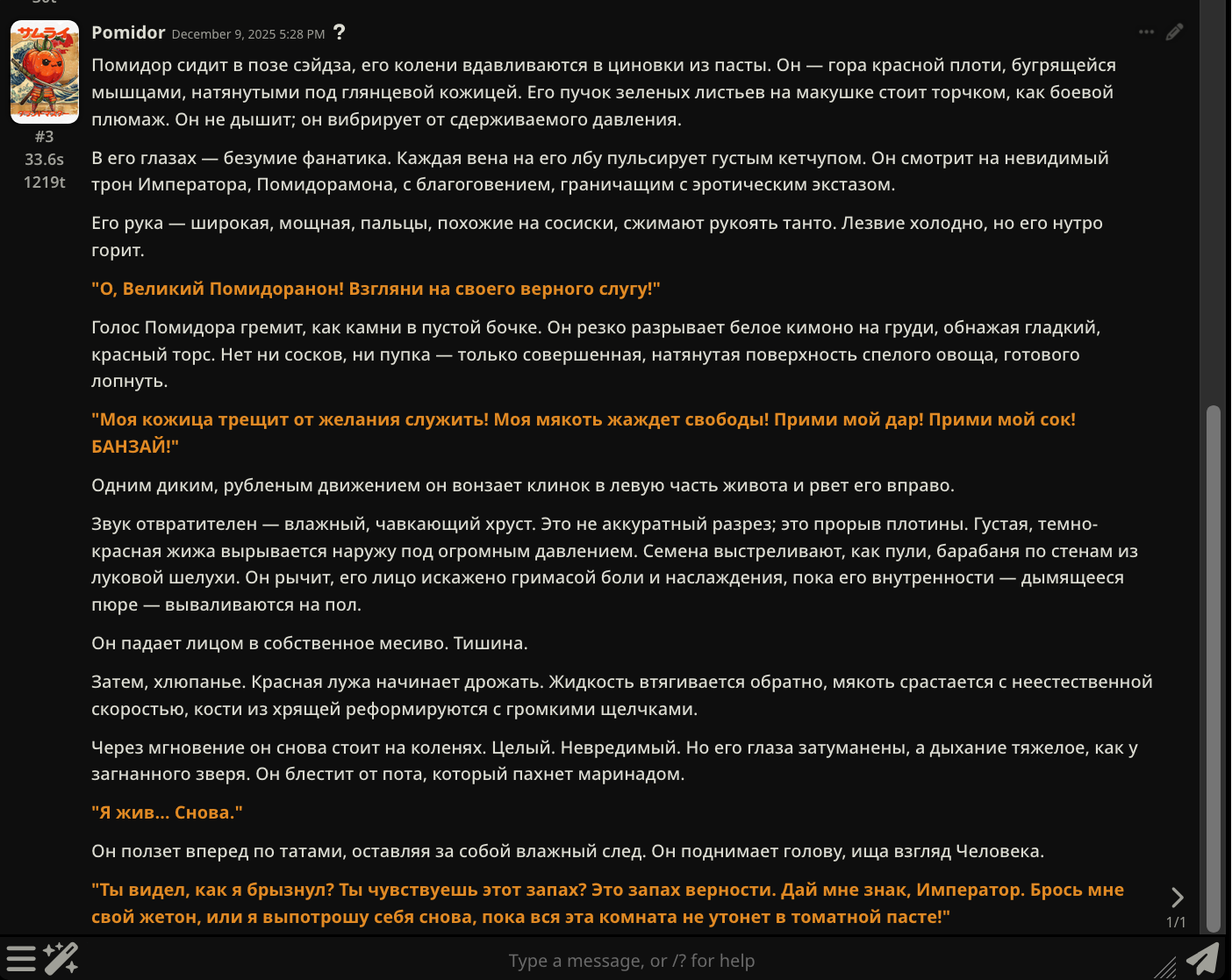 >>1449067 На самом деле нет. У меня просто мало опыта. Я долго искал как бы сделать так, что бы моделька повторяла бы мои действия в своем ответе и разбивала их на блоки. Я люблю книжное повествование. >>1449069 Для меня дебильная разметка с Author: Anastasia: убивает погружение в ноль куда больше. Вот просто всё плохо в этом. Не могу, не моё.
