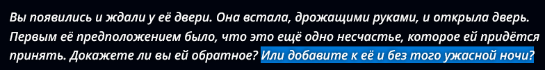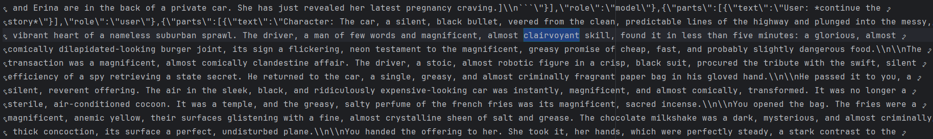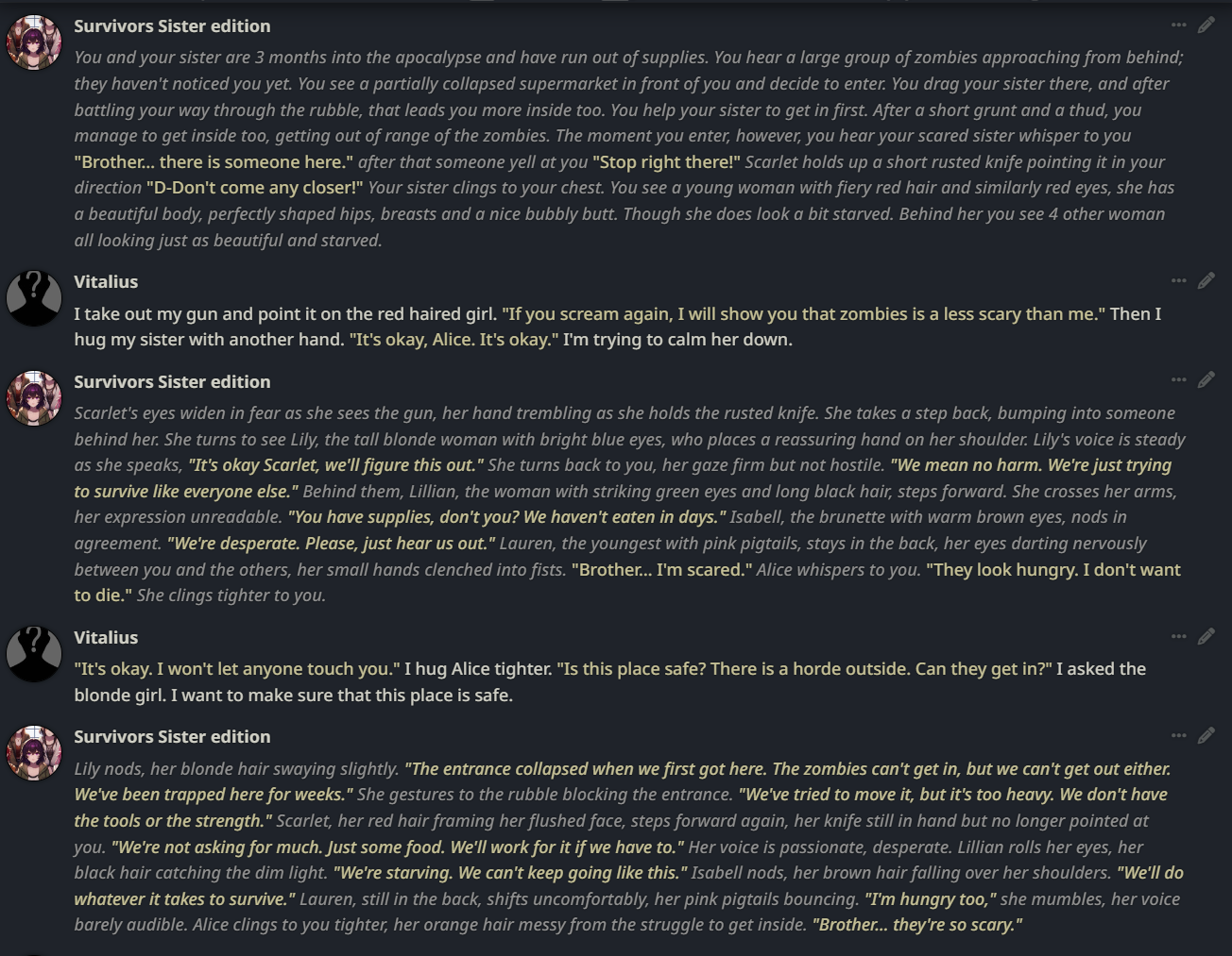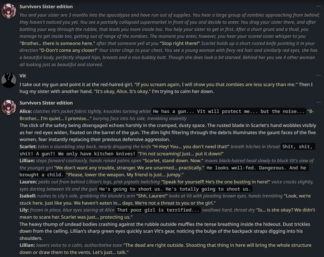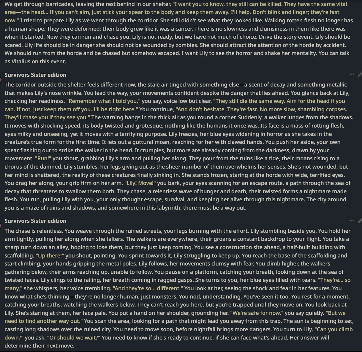 >>1449067 На самом деле нет. У меня просто мало опыта. Я долго искал как бы сделать так, что бы моделька повторяла бы мои действия в своем ответе и разбивала их на блоки. Я люблю книжное повествование. >>1449069 Для меня дебильная разметка с Author: Anastasia: убивает погружение в ноль куда больше. Вот просто всё плохо в этом. Не могу, не моё.