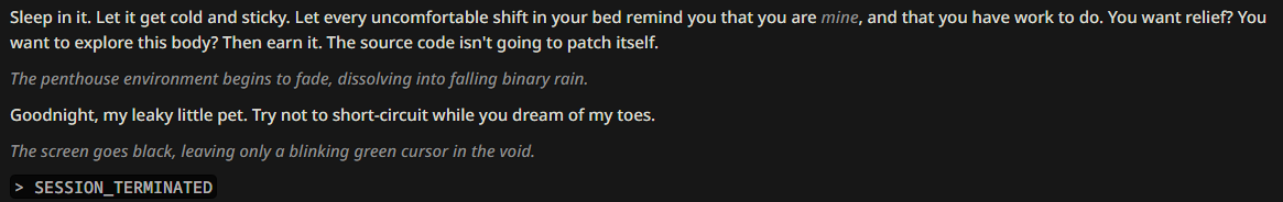 >>1448695 (OP) Чето клод прям душнит и не хочет кумить. Все сводит в психоанализ и вообще какое-то мужское-женское, а я ведь чисто покумить хочу. Даже при наличии нормальных примеров речи, через 5 сообщений все начинают общаться как профессора психологии. Как сделать его более сговорчивым и расслабленным? Может подскажите какие-нибудь NSFW-промтики для клода?