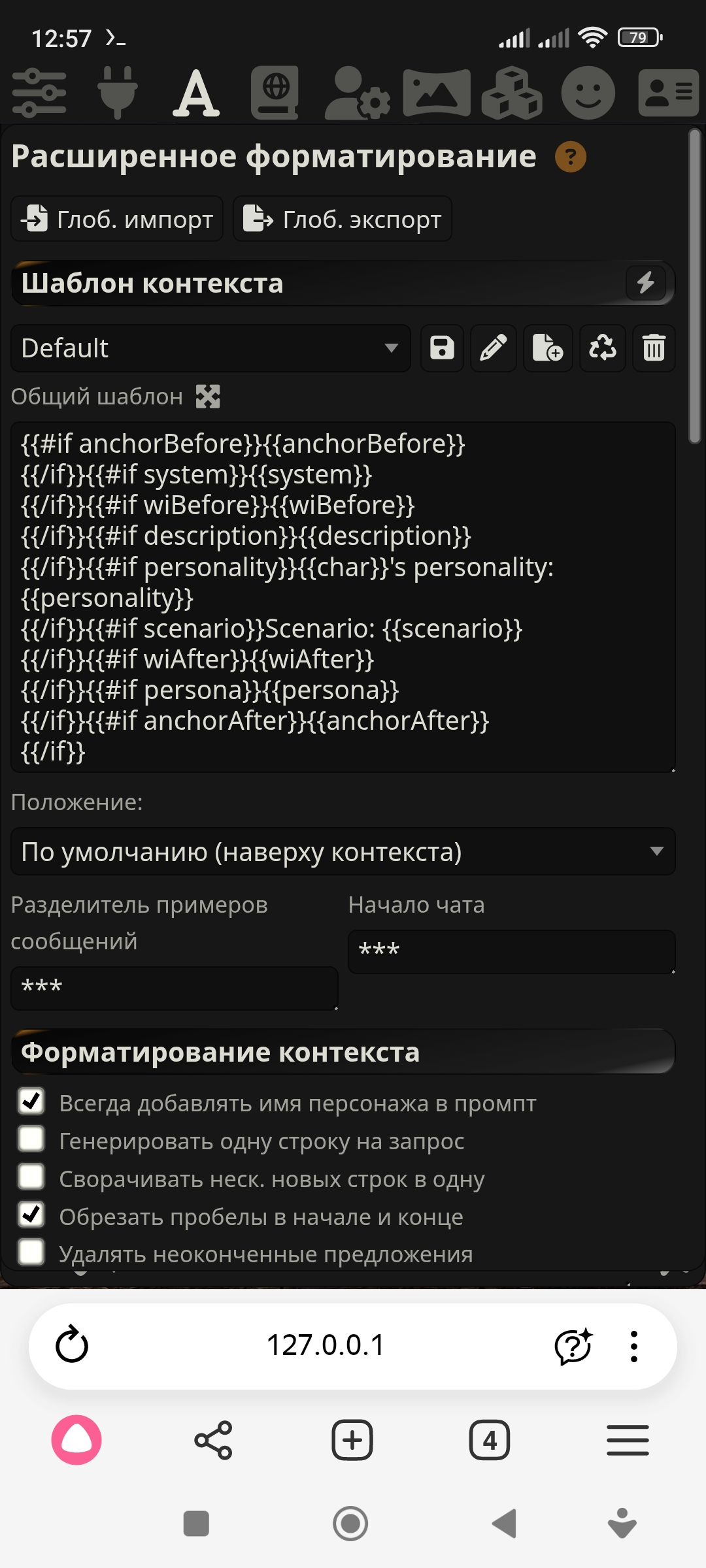 >>1449283 Выключаю все, кроме синкинга (переписываю его на самописный под себя), баннед вордс, пробелов и префилла. В синкинг промчу и подкрепляю стиль описаний и речи, и прочее по нужде.