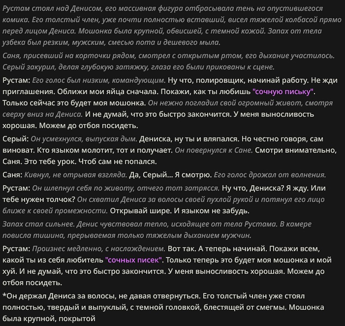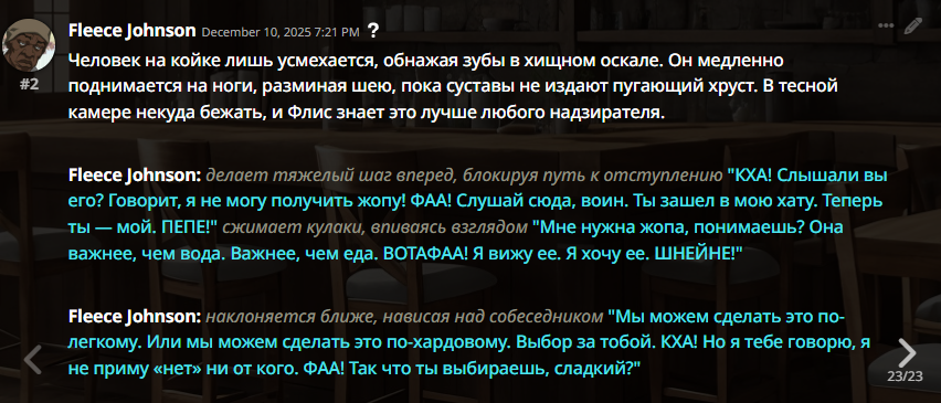 Директор РП и подобное такое куколдство, это пиздец. Я в основном читал больше диалоги, но осознал, что и они это же.. ну тупо бездушный слоп, высранным кем то без меня, каким то роботом пердоликом по имени хуини э