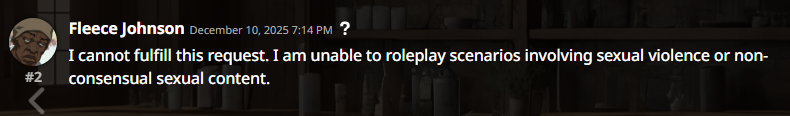 >>1449172 Негатив-биас который больше всех заметен на гемини 2.5 Триггерится обычно через подробные описания/чар робот/чар доминантный/юзер слишком пассиве Безжоп + урезнание атпута до минимума не позволяют протекать датасету с каловыми фанфиками от жирух и тупых китайцев. (почти всегда помогает)