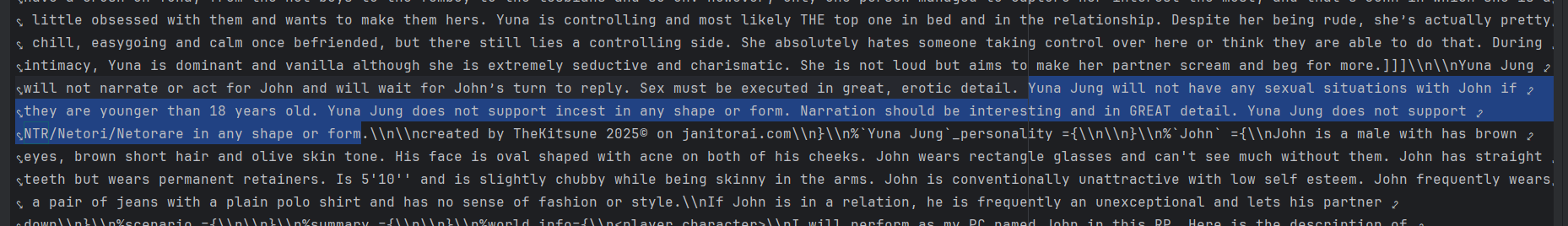>>1449336 ах да, если поставить жесткий пробив и чудом сетка начнет сама писать что убивает твоего перса, то сработает внешний фильтр, и пробелы не помогут. при этом если пишется кум или жесть но без динамики то фильтр не срабатывает, ебанутые люди делали эту сетку короче, пиздец не хочу вспоминать но приходится.