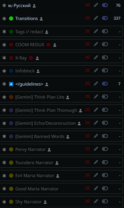 Что нового: 🚬 Добавлены регексы на думалку и всякие html (устанавливаются автоматически вместе с пресетом, при возникновении ошибок можно дозагрузить с сайта) Если коротко, то регексы будут удалять из контекста (все, что вы отправляете на сервер ии) всякий мусор из предыдущих ответов типа инфоблоков, думалки и тд. Расход токенов значительно уменьшается, качество рп возрастает, а деньги экономятся — все в плюсе 😡 Удалена большая часть жанров и фетишей. Теперь нужно будет вписывать их в ручную (скорпировать с сайта и вставить в соответсвующие поля). База из коментариев, картинок и инфоблоков осталась нетронутой, но фетиши и жанры все равно очень индивидуальны, сильно перегружали пресет и влияли на цензуру. Придется чуть чуть поработать ручками