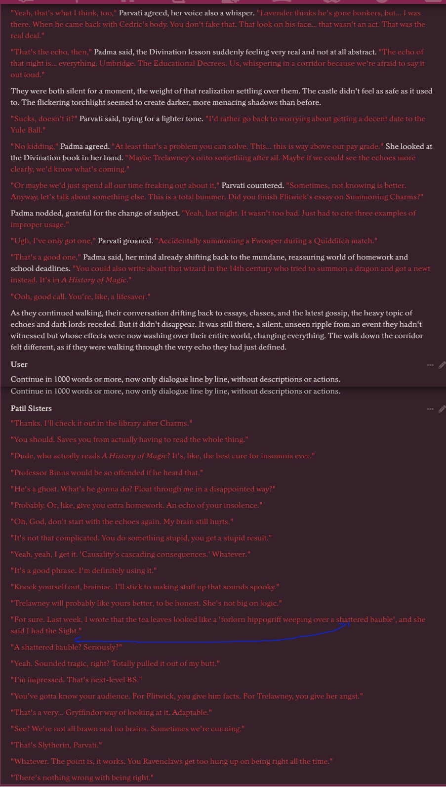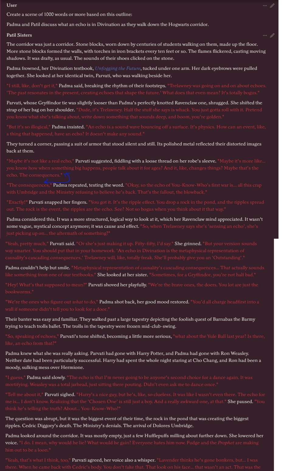 В любом случае закидывать сетке всё на похуй это долбоебизм, и тупо хуже работает, даже не столько в контексте дело. Лишнее отвлекалово и сложность только, которые её зафокусят на описанном мирке и не дадут накреативить. Ну не могут сетки за раз столько разнородной инфы переварить, особенно не сгруппированной, а раскиданной кусками по хистори и прочему подобному.