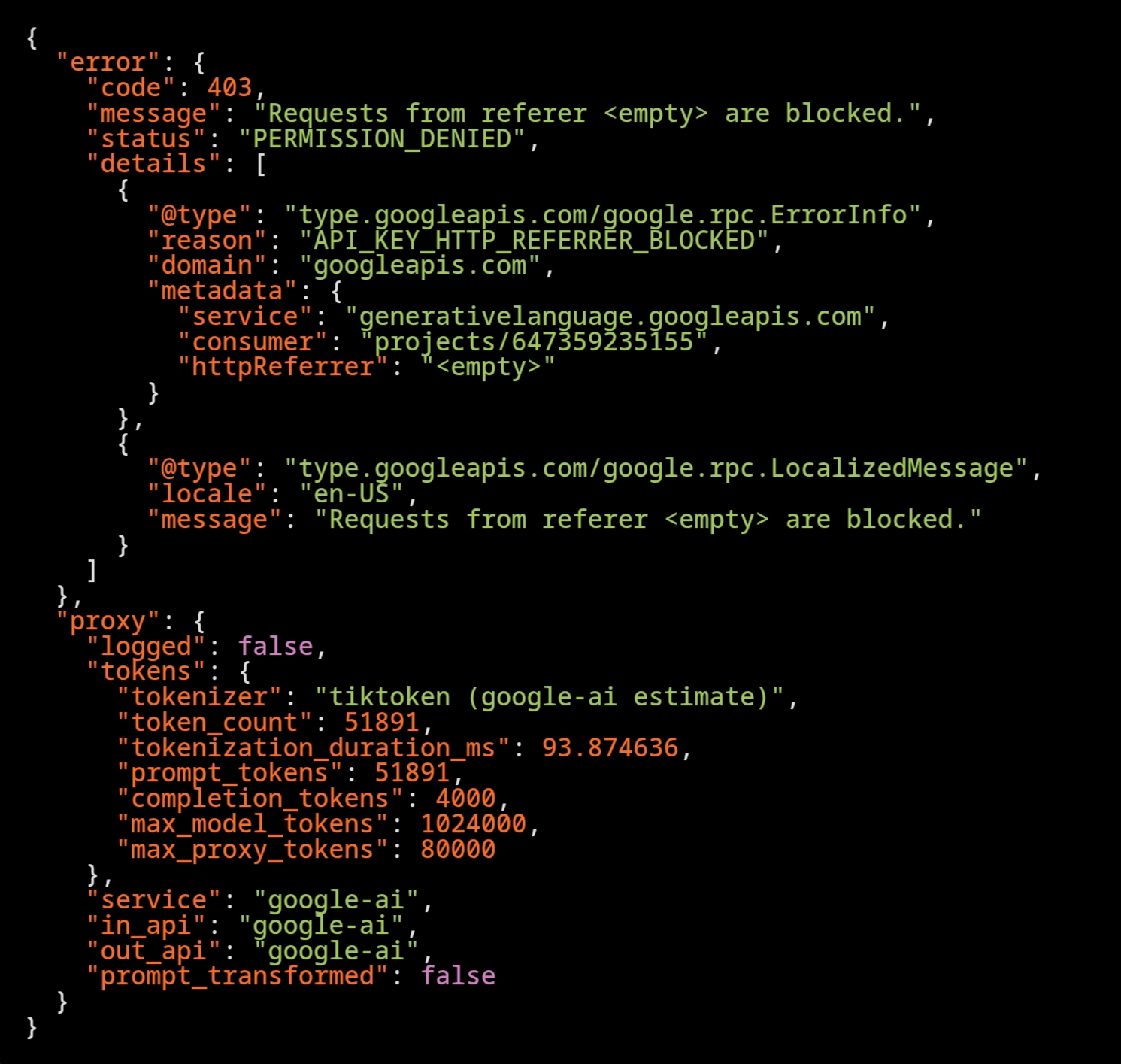 Пробовал пользоваться через Risu, ибо там запросы от его IP, там ключ норм ответ шлёт. Прокси запустил на Хаггинг Фейс, также норм ответ приходит.