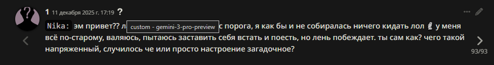 >>1448853 Я до недавних дней сидел на локалках и благодаря конкурсу, сейчас вот активно тыкаю гемини 3. И я не вижу особой разницы. Я взял два сценария которые гонял на варианте Мистраля - https://huggingface.co/zerofata/MS3.2-PaintedFantasy-Visage-v3-34B и прогнал ТЕ ЖЕ САМЫЕ ответы, но в гемини. Чисто по визуалу мне слог Мистрали нравится больше, т.к. ближе к книжному, нежели то, что выдает пресет РП у гемини. Я пока еще не сильно разобрался с пресетами, использовал этот - https://files.catbox.moe/j261gl.zip. пилю потихоничку под себя. Сейчас он выдает более менее то, что я хочу видеть. Как только освою окончательно, хочу сделать полный тест одного и того же сценария с теми же ответами, что бы сюжет шел в одном русле и сравнить: мистраль, гемини, клауди (его вообще пока не трогал даже).