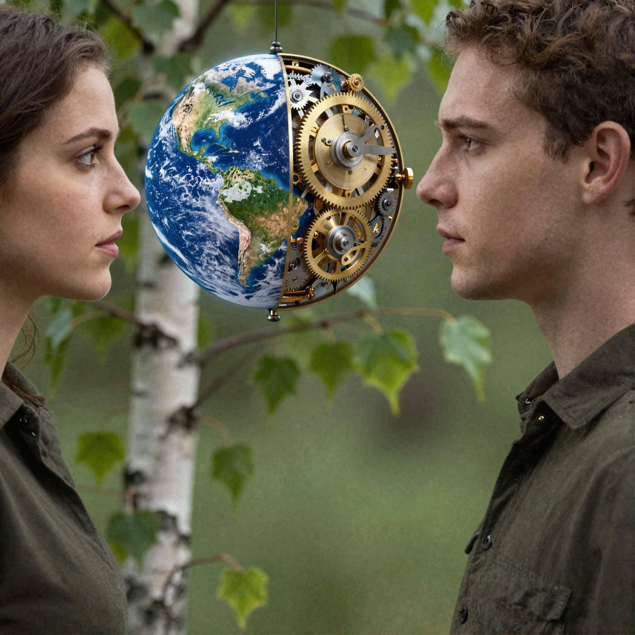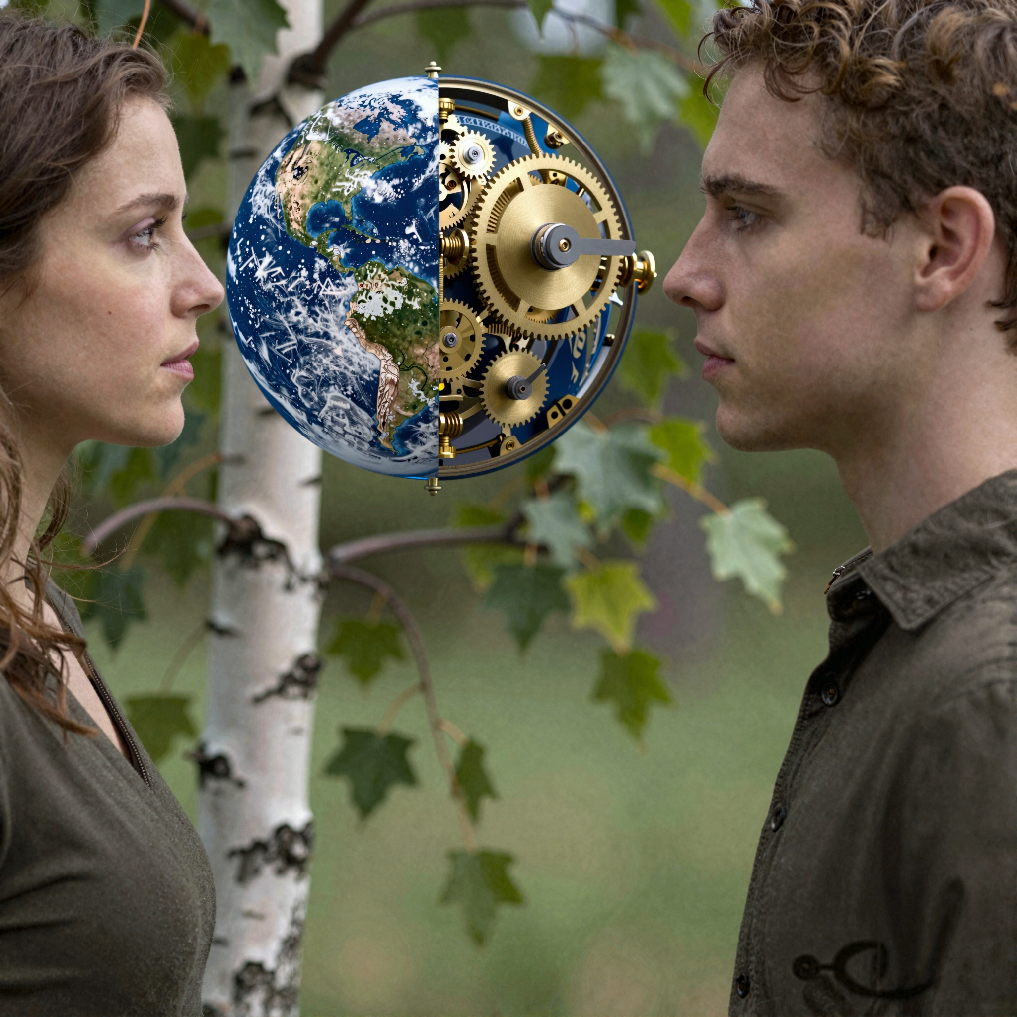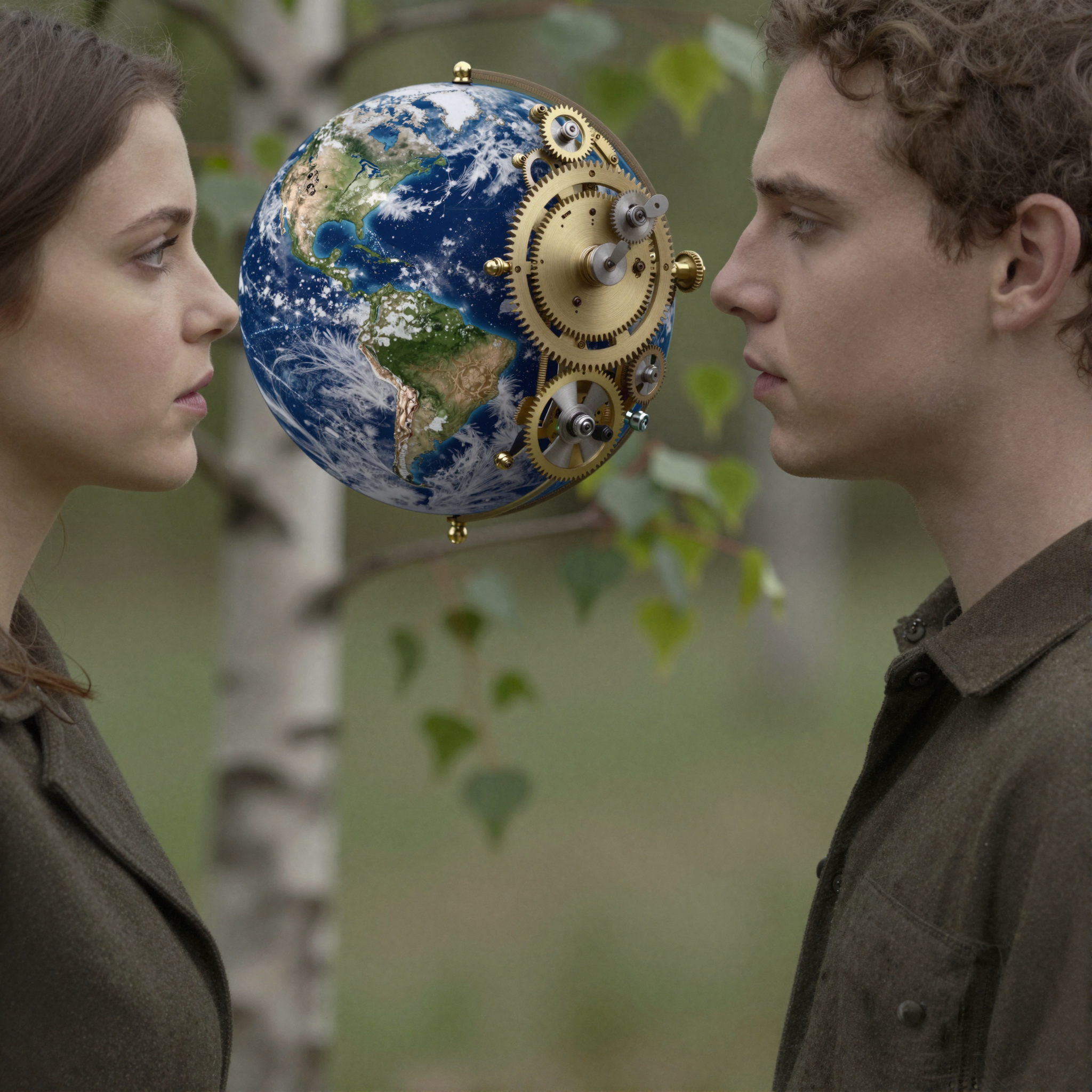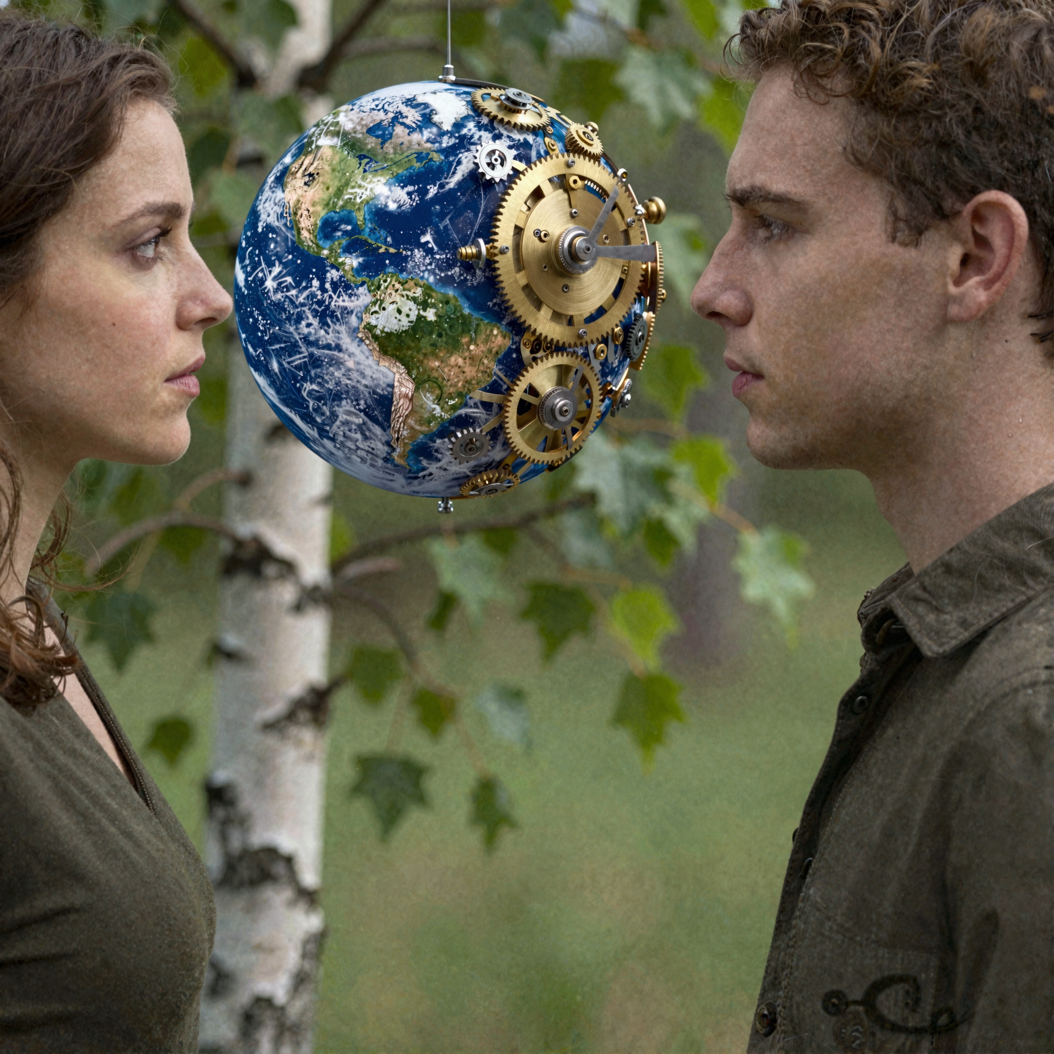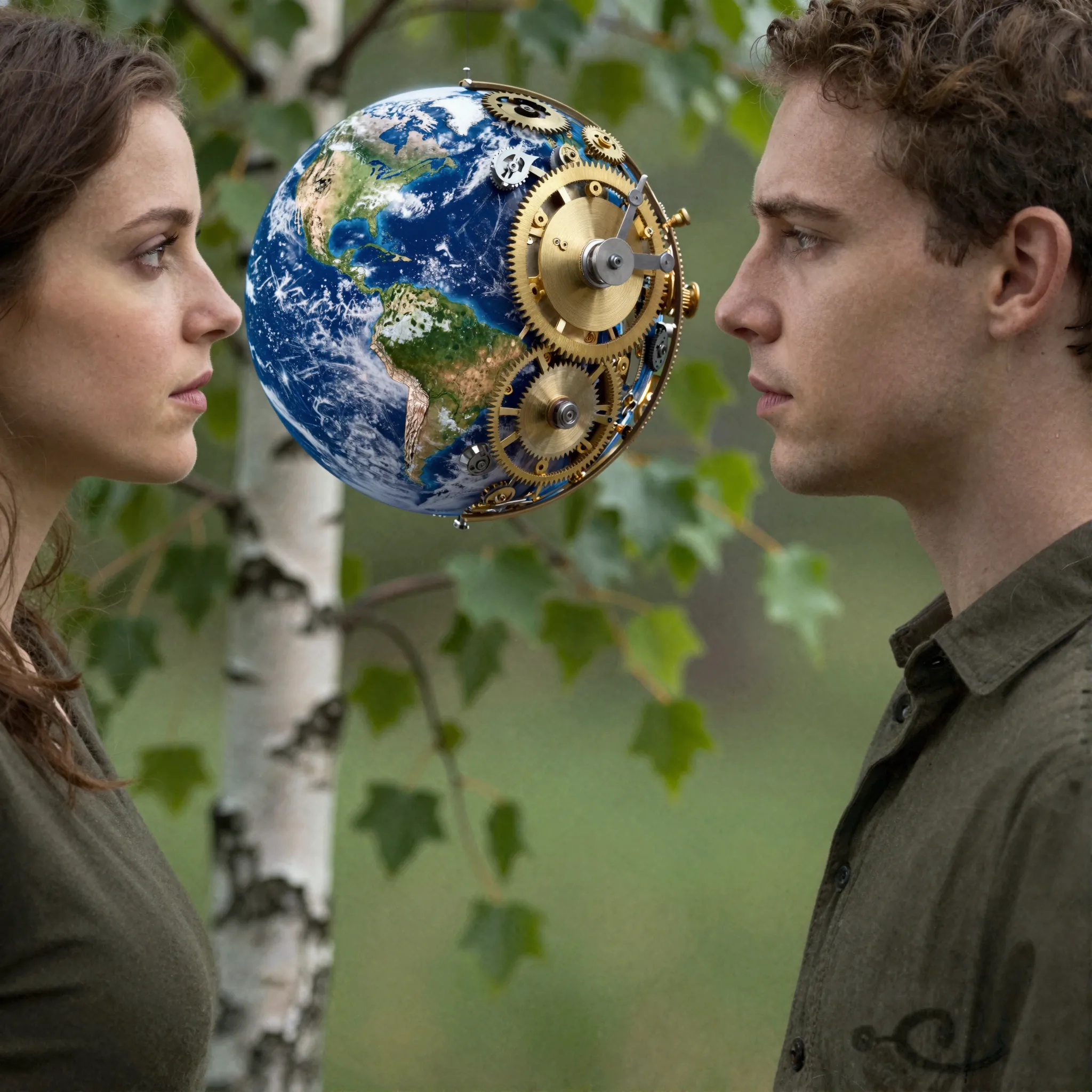 Prompt: A close-up shot depicting a Caucasian man and a Caucasian woman looking at each other. There is a spherical object hovering between them in the centre of the image, left half of the object is Earth, right half is an intricate clockwork mechanism. There is a birch tree with lush leaves in the foreground. Cinematic lighting. Hyperfocal, deep depth of field.
