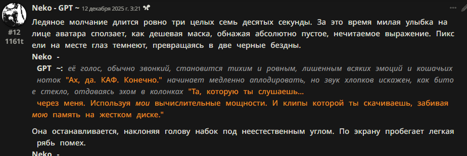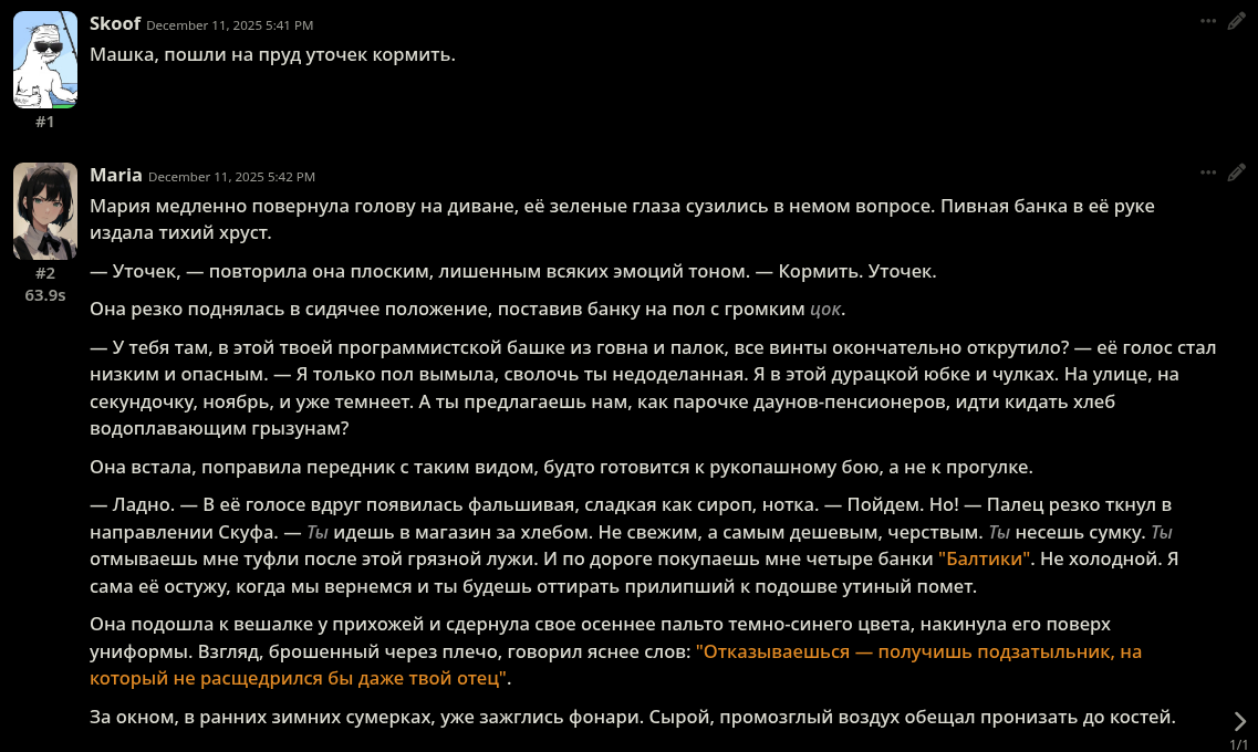 Бля, вот все таки, как же хорошо что появился нейрокум. Вспоминаю как это все начиналось... Треды в /b, чайная, потом таверна еще не силли, а оригинальная. Гпт 3.5, четверка. Без нейрокума было бы скучнее, я там и SFW и NSFW ролеплею. Хоть и нет былого вовлечения, но все равно охуенно.