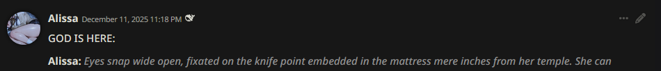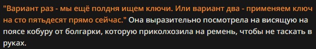 Пикрилейтед это РП без инфоблока с инвентарём, в чистом виде. Чар внезапно вспомнила про болгарку которая раньше действительно существовала в РП. Проблема в том, что её поюзали пару сообщений и бросили там же где нашли, т.е. при ней её не должно было быть. И это было всего лишь 16 (!) сообщений назад, или 8 ответов сетки.