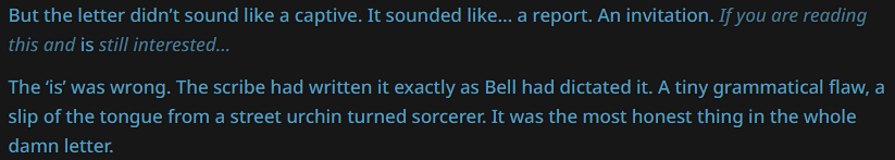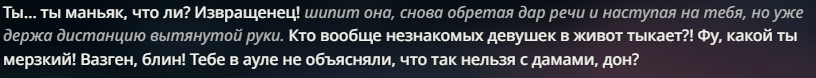 >хихикает, слегка покраснев "А почему у неё только два кинжала? Можно же больше! Один в сапоге, один в волосах. И ещё один спрятать в... ох." замолкает, понимая, что опять увлеклась, и утыкается носом в свою кружку с водой один этот отрывок с опуса 4.5 лучше всего что есть на члемини 3