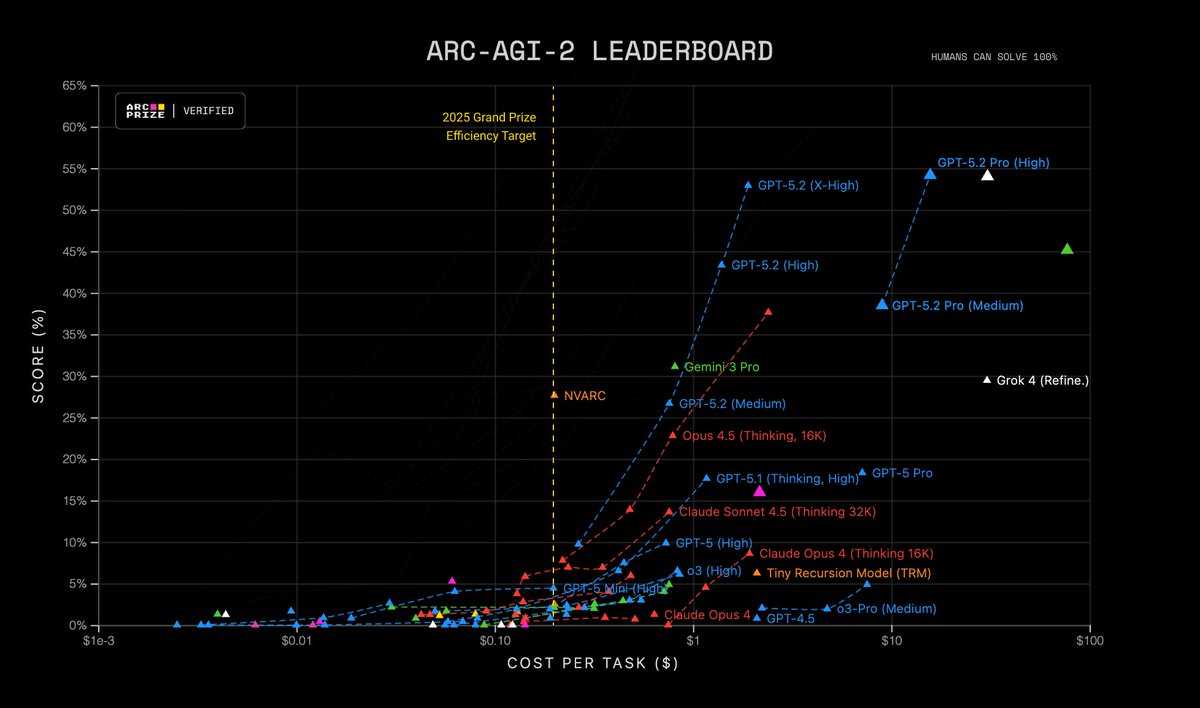 Новая GPT-5.2 поставила рекорд в сложнейшем «бенчмарке на AGI» 2 мин 11K Искусственный интеллект Машинное обучение * OpenAI представила GPT-5.2 — свою новую флагманскую модель, которая доступна в API и раскатывается в ChatGPT. А организация ARC Prize уже опубликовала результаты своих бенчмарков ARC-AGI-1 и ARC-AGI-2, которые считаются сложным тестом на абстрактное мышление и нередко называются "экзаменом на AGI". Модель заняла первое место в обоих бенчмарках, но остановимся на результатах ARC-AGI-2 — эта версия была выпущена недавно и считается, что ее задачи еще не "попали" в обучающие дата-сеты для ИИ.