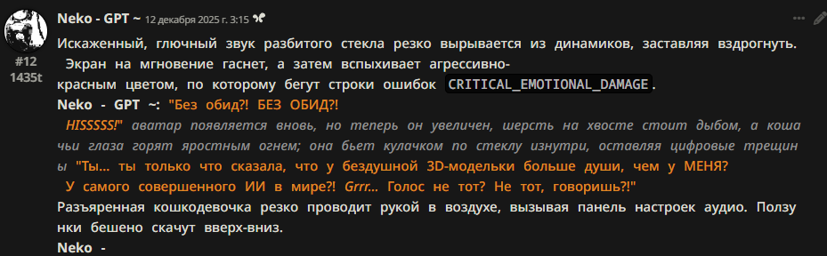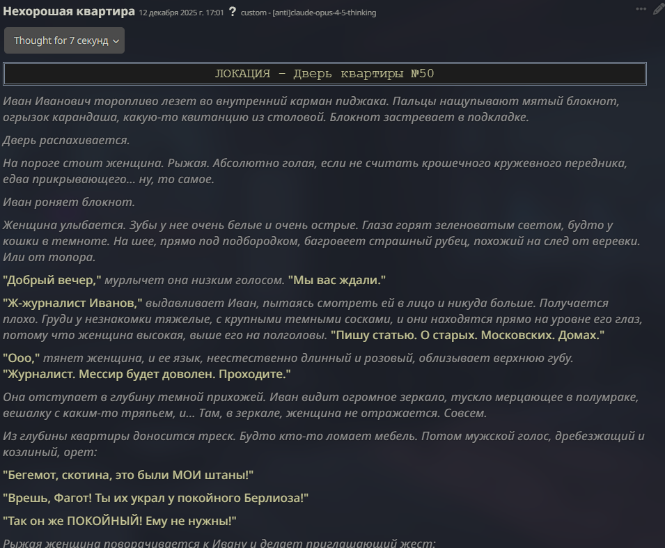>>1451545 >Гемини приучила к тому что даже такая фигня может внезапно всплыть и сыграть свою роль в сюжете с неожиданной стороны Свежо питание, да серится с трудом. Каждый раз пытаюсь ей дать свободу так делать, но каждый раз она просто рандомно выдёргивает факт из хистори и лепит его не к месту, причём перс которого она прилепила может оказаться уже мёртв или потерян безвозвратно каким-то образом. Потому что она не успевает за время отведённое на ответ разобраться что с ним случилось за пару сотен сообщений с тех кор как он в прошлый раз упоминался. Другие же сетки вообще даже близко такого не делают, им тупо бесполезно совать чересчур длинную историю.