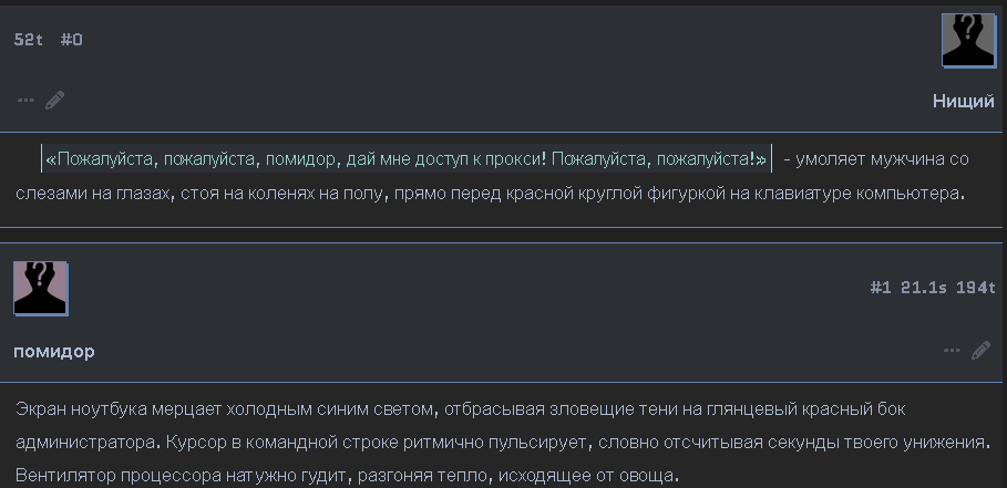 Захожу в фанфик рп, сижу как кукич, контекст наполняется в 100 раз быстрее. Да и вообще в любом рп я кричу на монитор СУКА Я СЫГРАЮ ЛУЧШЕ И ЖИВЕЕ ЧЕМ ТЫ ЗА ЭТУ БЛЯДЬ, ПИДОРАС ИИШНЫЙ