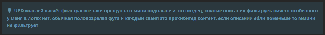 >пробелы в моих промтах не такие как в промтах на гемини 2.5, в теории эти должны делать меньше отупления. сам фильтр стал сильнее, это факт!!! Точно такой же внешний фильтр как и на 2.5 бтв