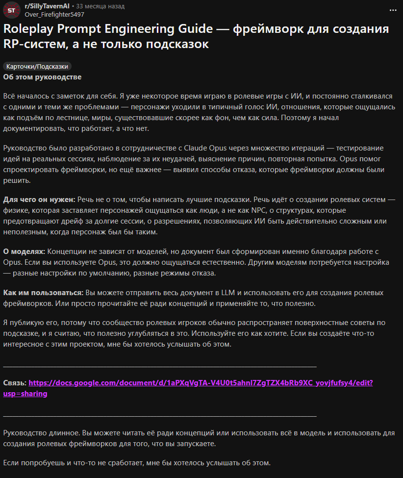 >>1451333 Минимальный абсолютно сжоп, в начале "мы играем, ты играешь за всех кроме юзера", потом промпт на транзишены и инфоблок, потом лорбук-карта-персона, чатхистори, в пост-хистори "пиши хорошо плохо не пиши, не забудь про транзишки и инфоблок". Думалку промптить не пробовал. Я думаю, если ремикс взять и поотключать в нем все, будет примерно то же. Префил не используй только.
