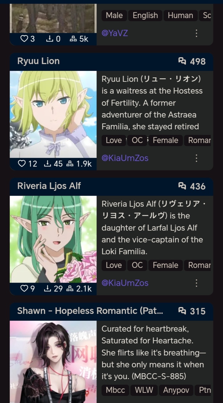 >>1454589 Хорошая карточка, несмотря на холивары. У меня последние три месяца такой странный фетиш. Я когда вижу чью-то карточку новую в треде, то сразу качаю и иду кумить, когда есть время. Но каждое мое рп заканчивается тем, что тяночке смачно разрывает жопу крюком в обязательном порядке. При этом на самописных никогда так не делаю, все ванильно постоянно. Сеймы есть? Почему так?